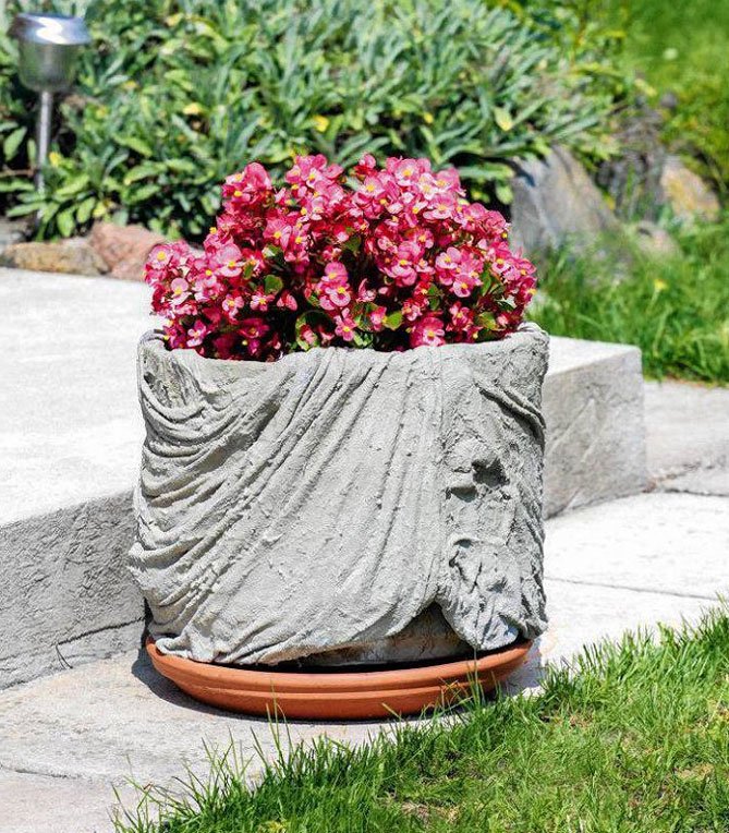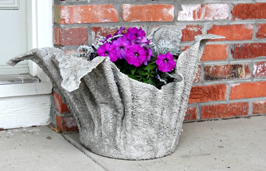 Una forma original y sencilla de hacer una olla callejera al aire libre sorprenderá a todos los invitados y a los que viven en casa. Una idea interesante puede hacerse realidad con un trozo de tela innecesaria, mortero de cemento. Como elementos adicionales, necesitará un molde para la futura maceta, un balde y una batidora para amasar la mezcla, película adhesiva, pinturas acrílicas para dibujar.