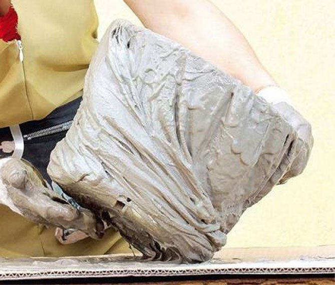 Obtenemos la tela en cemento y la transferimos a la forma, enderezamos los bordes, le damos la apariencia deseada a la maceta futura;