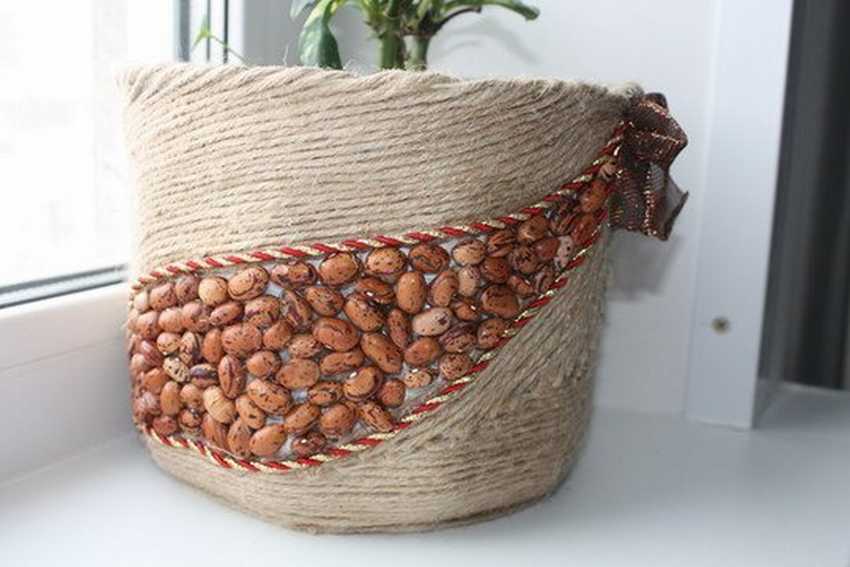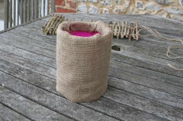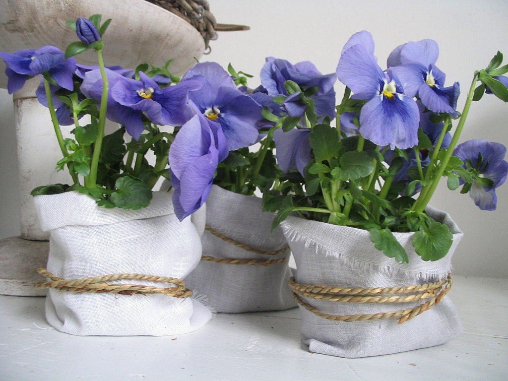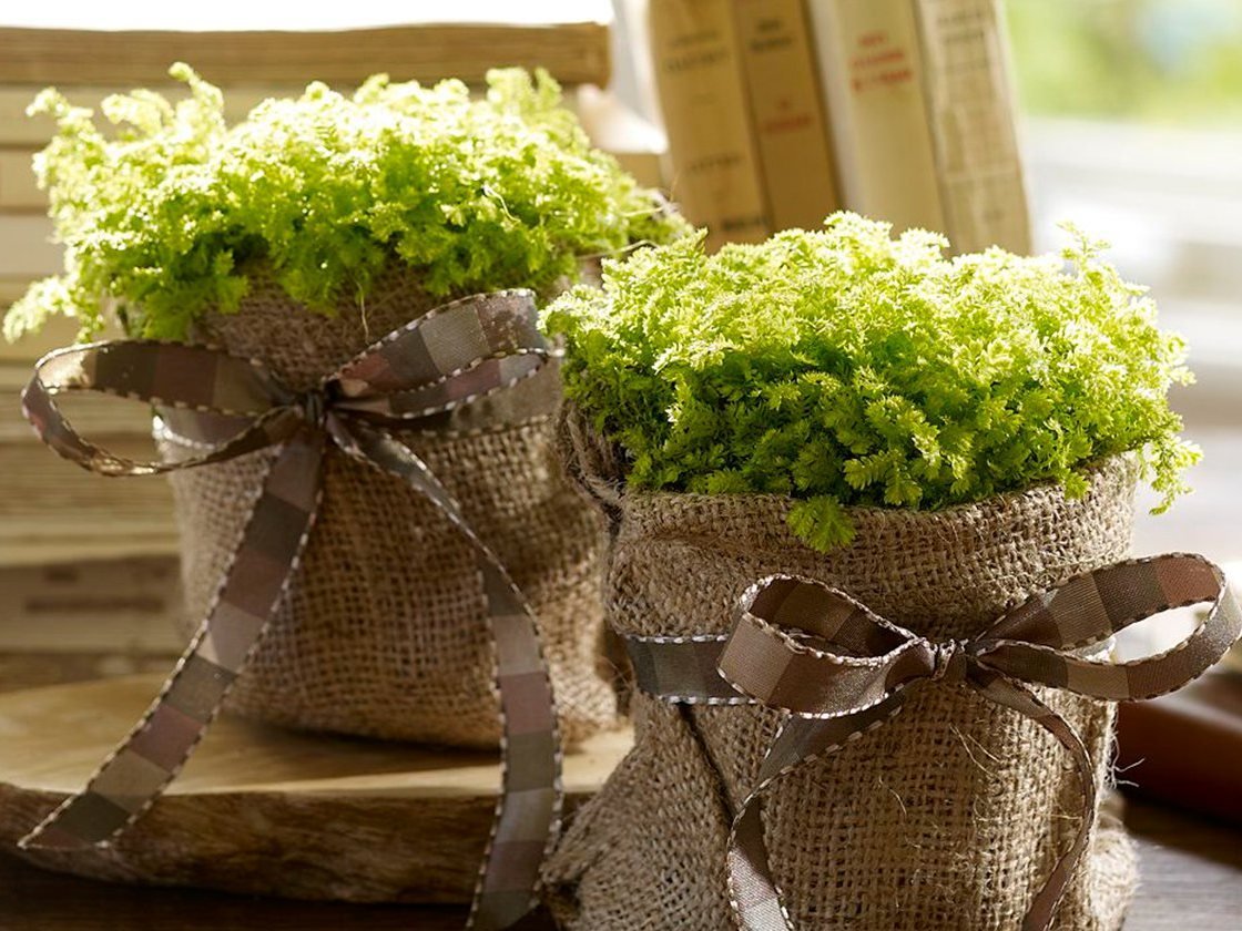 La joyería de arpillera es más adecuada para macetas en el jardín. Tal contenedor se puede usar como accesorio, dándole al patio un aspecto rural. La tecnología de fijación del material es idéntica a la del encaje. Plantar en un contenedor de este tipo es mejor para arbustos bajos y verticales, que se asemejan a un puñado de orejas jóvenes.