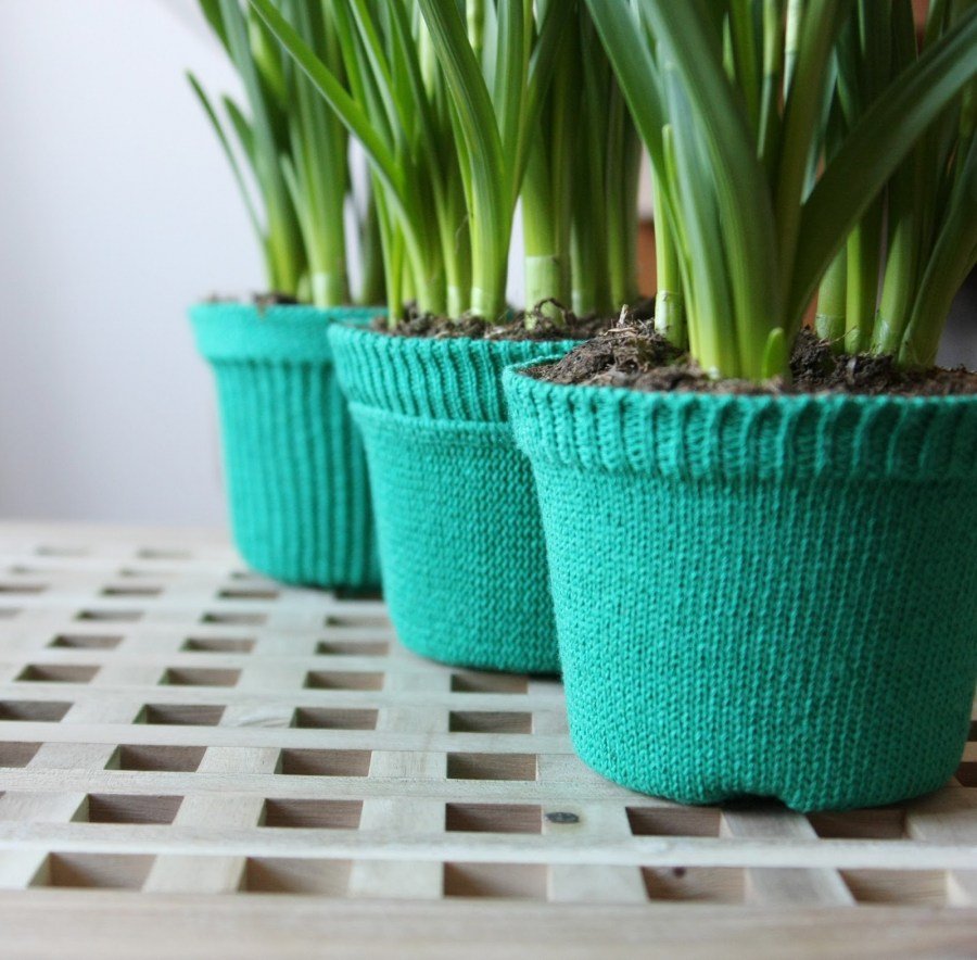 Las fundas tejidas para macetas se pueden hacer en agujas de tejer o cortar las mangas de un suéter viejo. También puede usar algunos de los calcetines viejos en el área de las encías o mitones anticuados.