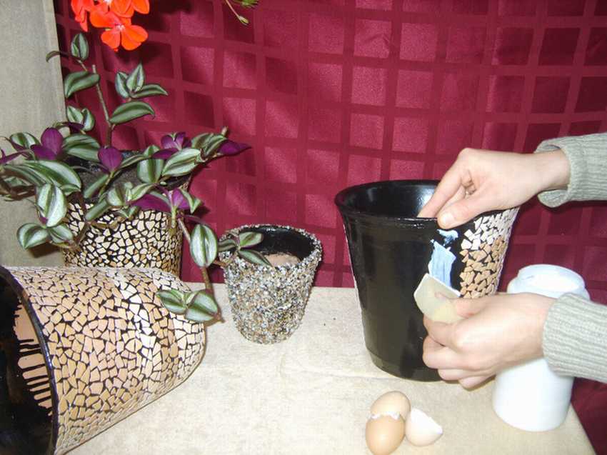 Aplicamos el adhesivo a la maceta, colocamos la cáscara triturada con una parte convexa en la cara y presionamos suavemente;