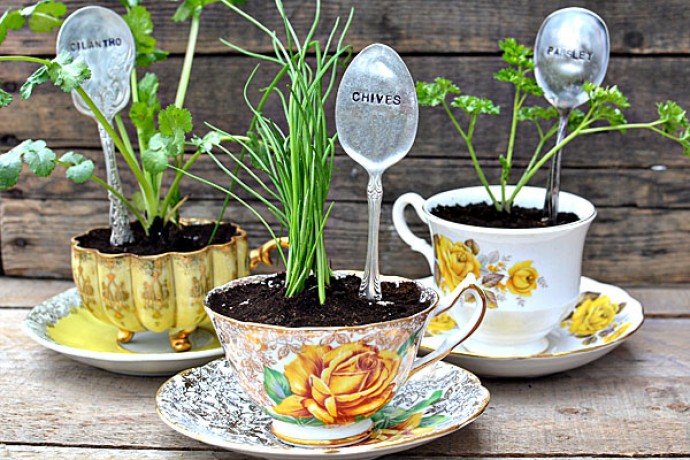 Con estilo se ve cualquier verde vivo en tazas y tazones viejos. Los platos con fugas tendrán una segunda vida si muestras un poco de imaginación. Saldrán camas originales en un árbol de viejas teteras de metal.