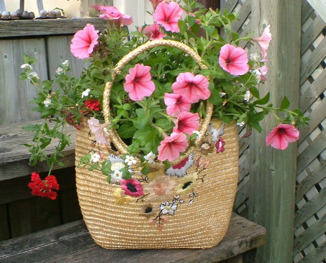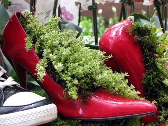 Incluso se pueden hacer hermosas flores con bolsos o zapatos viejos. Las botas de goma con plantas trepadoras, los zapatos en la entrada de la casa con lindas flores definitivamente traerán una sonrisa a los invitados.