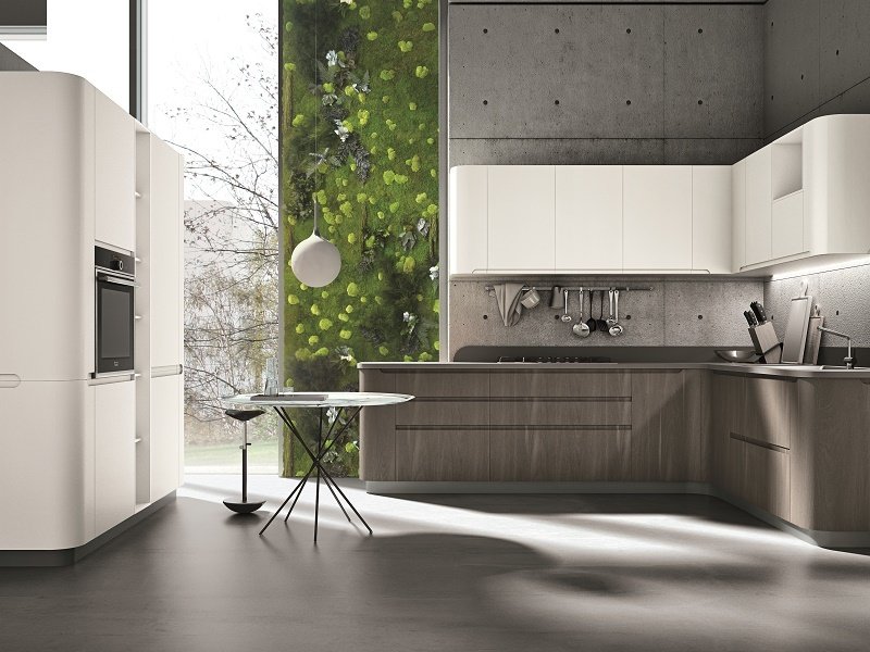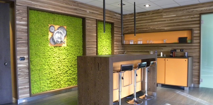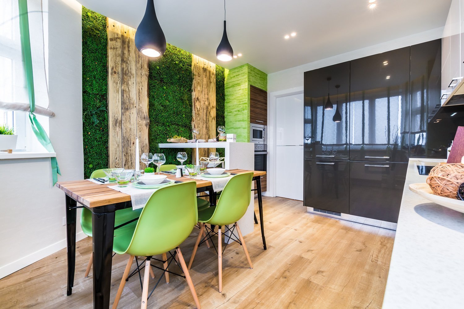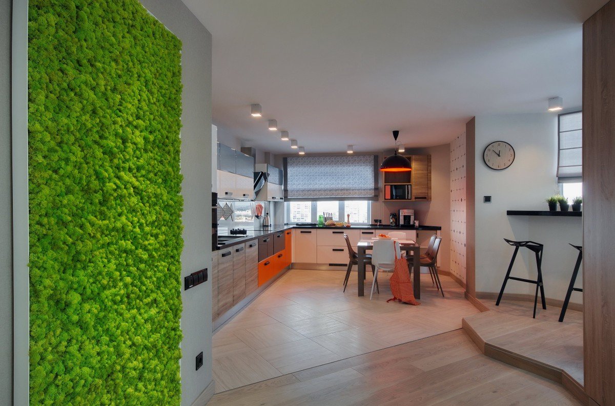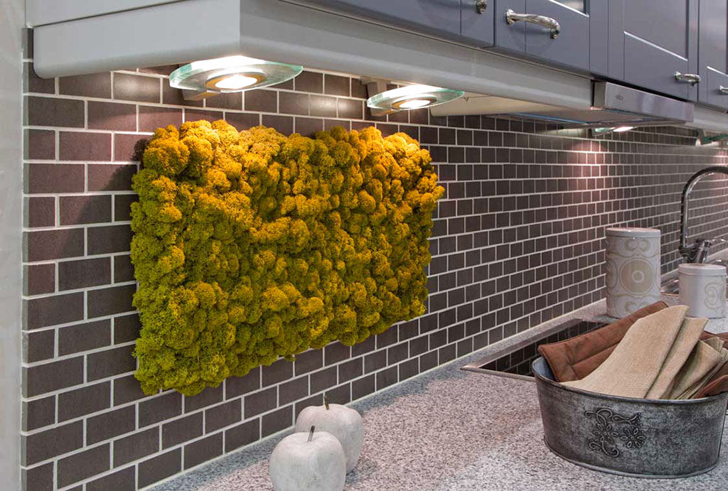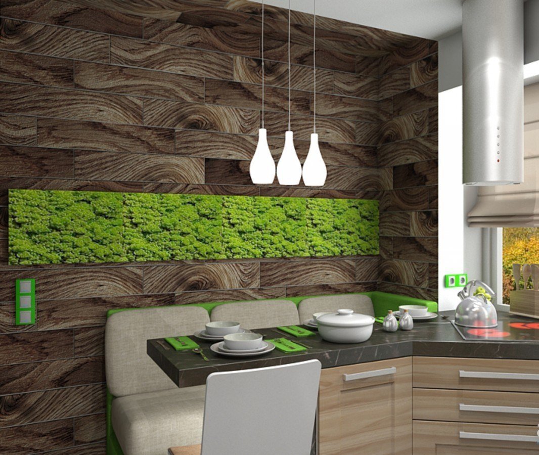 Diseñar una cocina con verduras inusuales se puede hacer de muchas maneras. Por ejemplo, use materiales originales para crear pinturas. Idealmente complementan el área de recreación, la hacen más cómoda. La estilización del delantal se verá genial: se puede colocar a la mitad o un tercio de los verdes a granel. Es cierto que debe colocarse en la parte superior. El impacto directo de la iluminación artificial en la parte verde del delantal lo hará lo más atractivo posible. Además, la basura del área de trabajo en esta ubicación no caerá en el cálculo. La solución original será el uso de paneles con musgos para zonificar el área de trabajo y el área de alimentación. Para hacer esto, las tiras divisorias deben fijarse en las paredes y en el techo. Un par de paneles que enmarcan un conjunto de cocina alrededor de los bordes también se verá elegante.