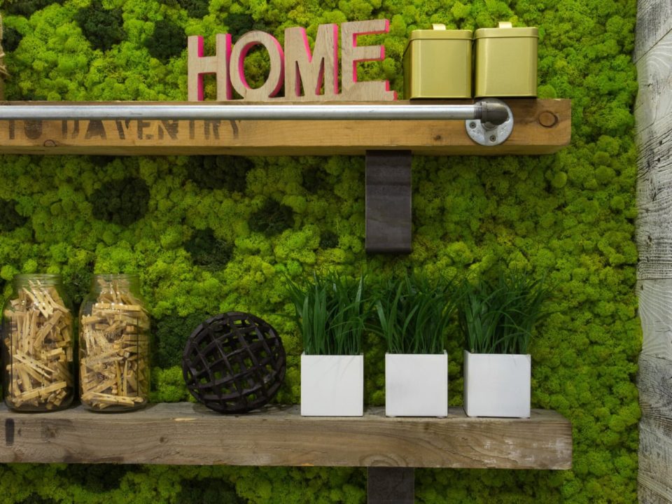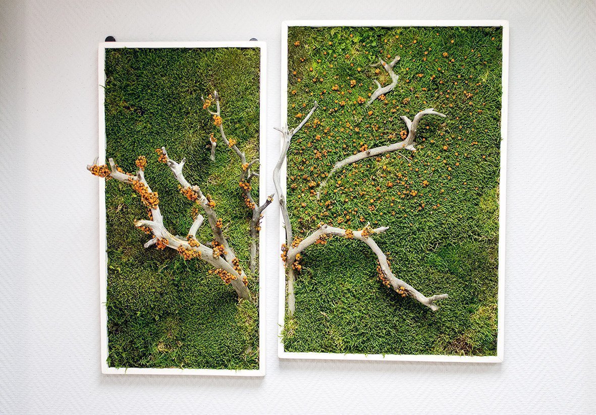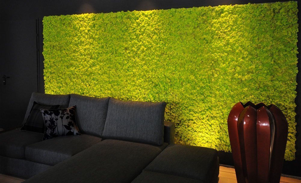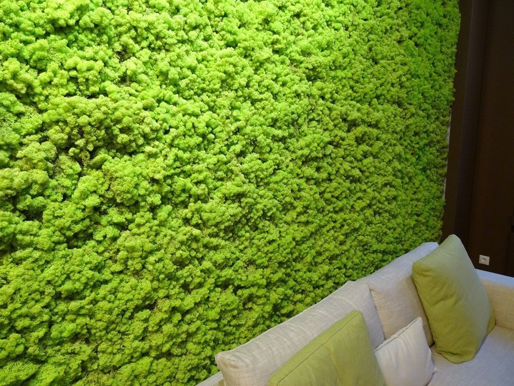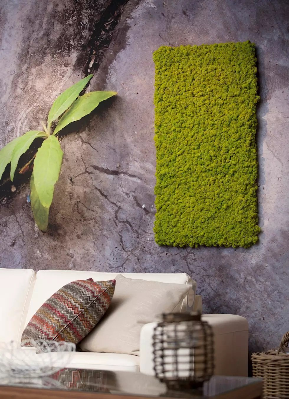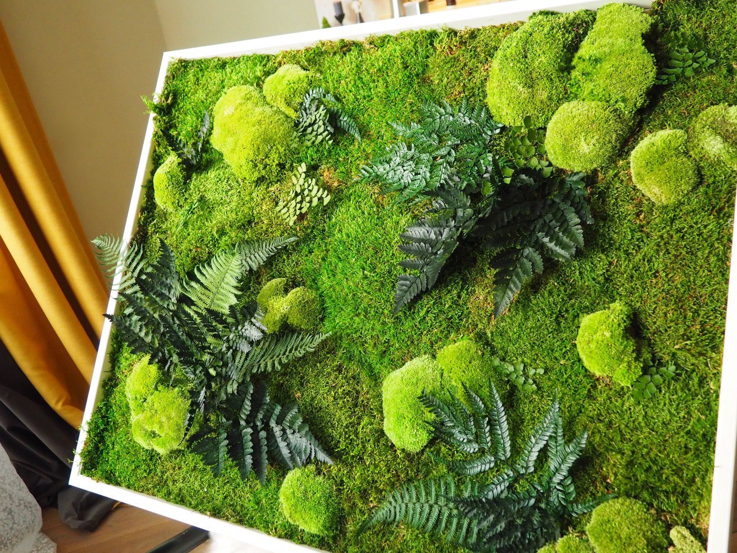 No existen restricciones especiales sobre el uso de verduras estabilizadas. Es ideal para decorar paredes, resaltar partes individuales de habitaciones o zonificarlas. Suele utilizarse para crear un ambiente confortable y acogedor. Se puede usar para estilizar ciertos tipos de muebles. Los artesanos modernos producen muchos adornos terminados con plantas de esporas: pinturas, inscripciones, composiciones. Para el estilo, también se utilizan paneles grandes, que son un lienzo largo decorado con vegetación. Los paneles son adecuados para la fijación en las paredes con tornillos autorroscantes, clavos líquidos. No necesitan un uso adicional de materiales impermeabilizantes. Después de instalar dichos paneles, la superficie detrás de ellos permanece completamente seca. Además, algunos maestros usan plantas voluminosas para la fijación directa a paredes, estantes, pisos.
