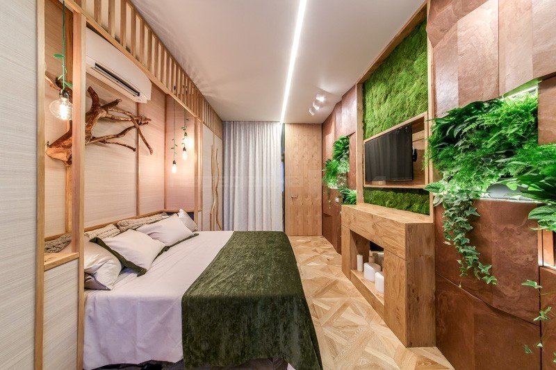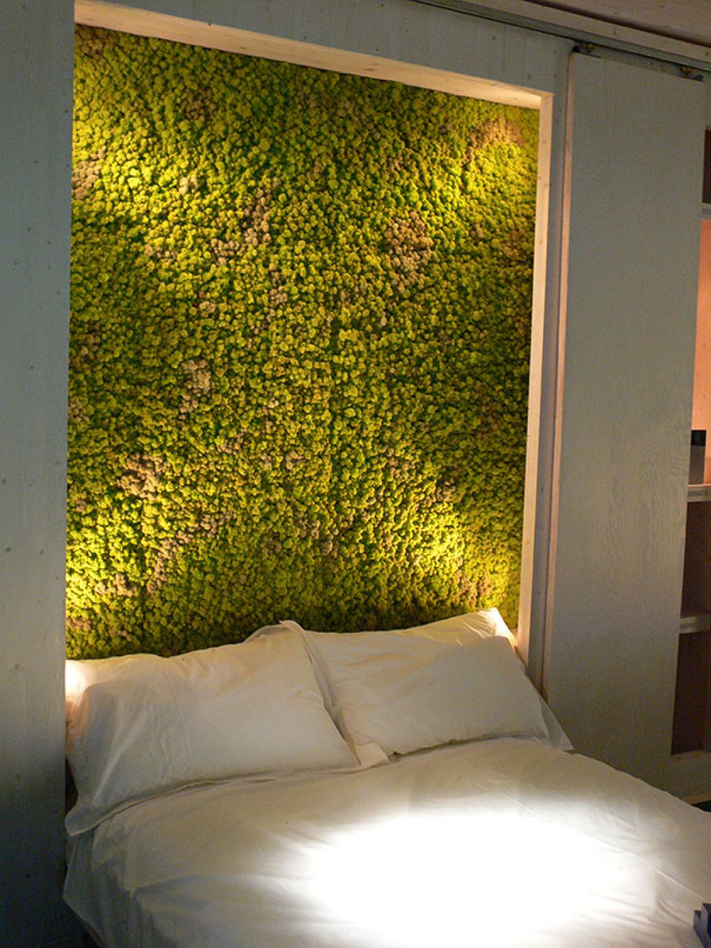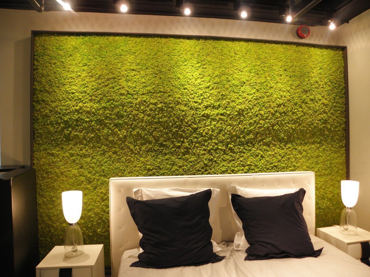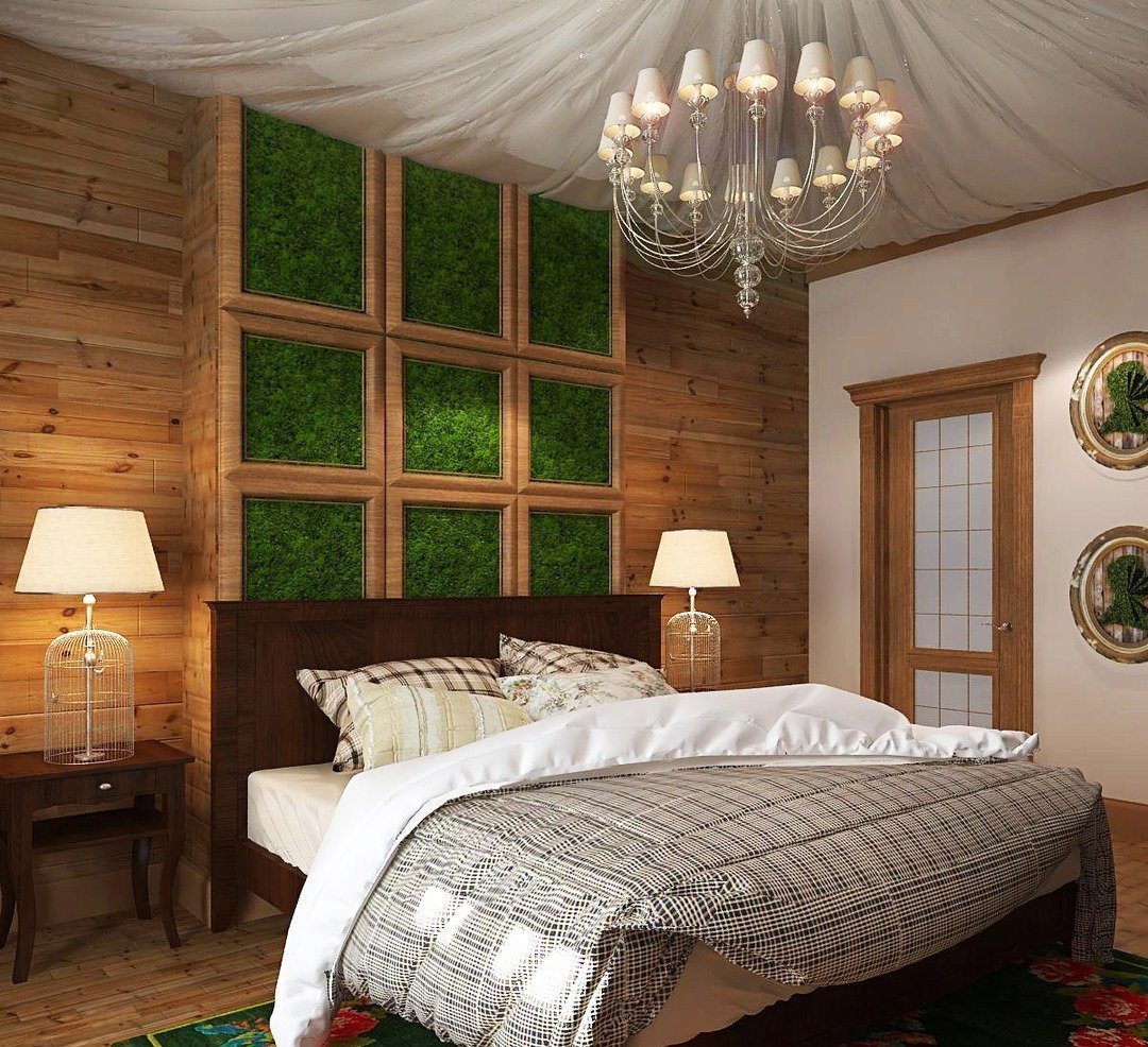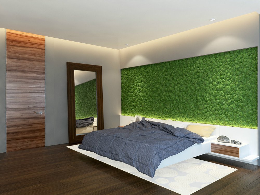 En el dormitorio, los paneles verdes enmarcados por protuberancias de cartón yeso arriba y abajo se verán originales. Al resaltarlos visualmente, aumentará la profundidad de los nichos creados y liberará espacio. Una solución ventajosa será la instalación de paneles sobre el área de trabajo (escritorio o mesa de la computadora). Contribuirán a la creación de un confort especial. La ubicación de las plantas de esporas frente a la cama proporcionará una estancia confortable. Pueden enmarcar el televisor o montarse esporádicamente sobre toda la superficie de la pared. El marco verde de la cabecera también se ve inusual. Puede ser un marco delgado u ocupar todo el espacio libre detrás de los muebles. Un par de pinturas o fotos familiares encajarán bien con dicha decoración de pared. También puede distinguir bellamente con un musgo el pasaje al balcón, las aberturas de las ventanas.