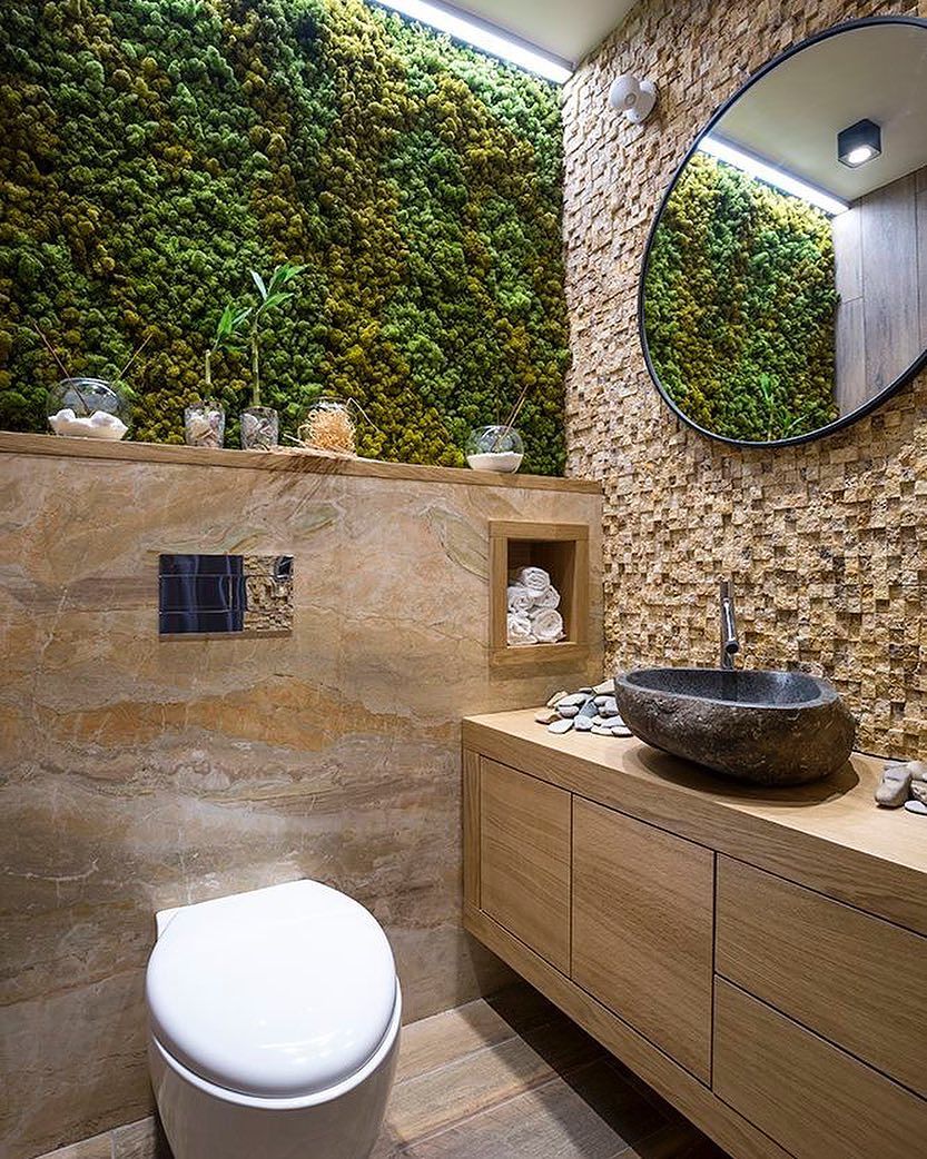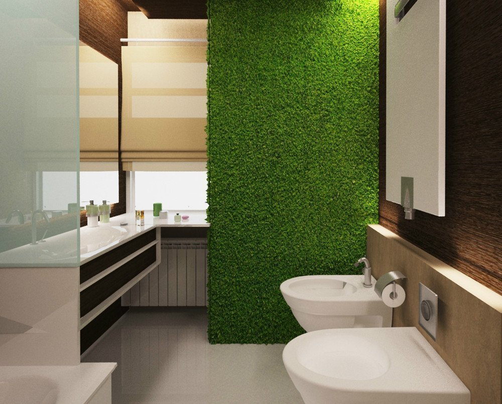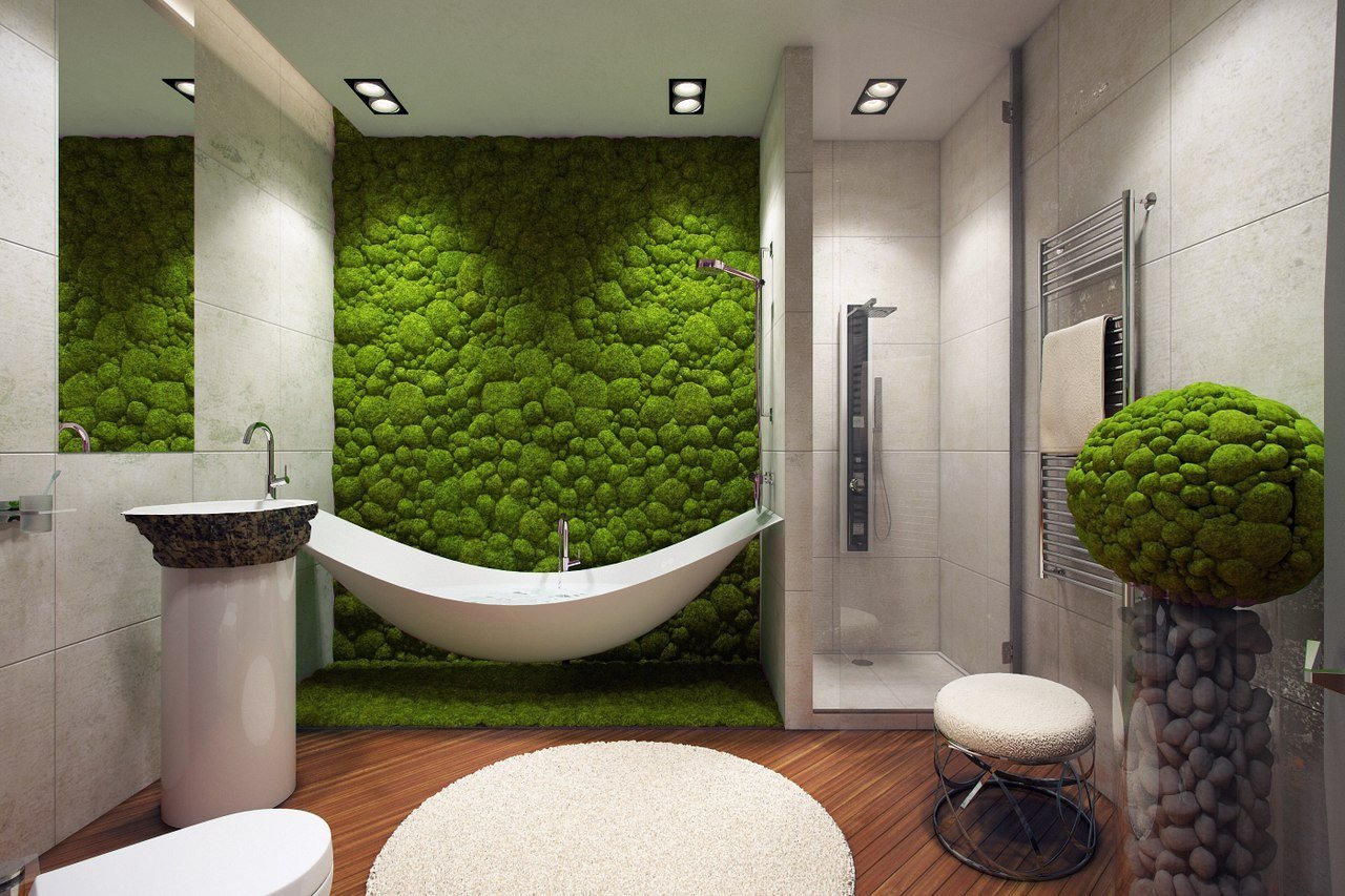La decoración del baño con verduras a granel debe llevarse a cabo con especial atención. Las plantas estabilizadas deben ubicarse lo más lejos posible del área de la ducha. De lo contrario, el agua que ingresa al panel verde hará que se eche a perder rápidamente. Es mejor colocar dicho adorno en la pared opuesta al alma. Se debe tener cuidado de que el agua del lavabo no caiga sobre la superficie del musgo. Un marco verde muy hermoso se verá alrededor del espejo. Con él, puede enfatizar la originalidad del diseño de estantes, muebles instalados para almacenar toallas, cosméticos.