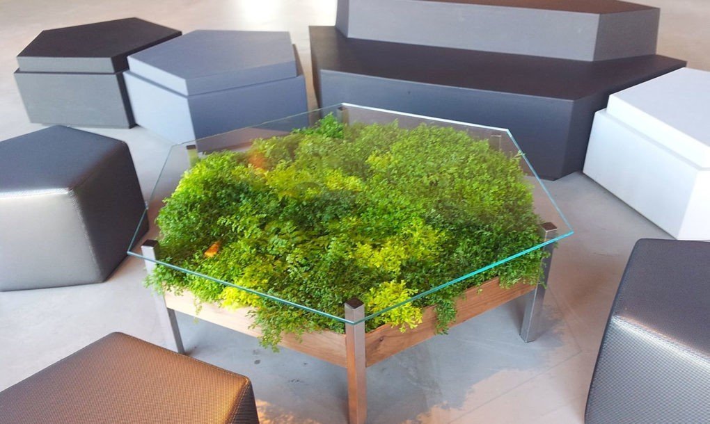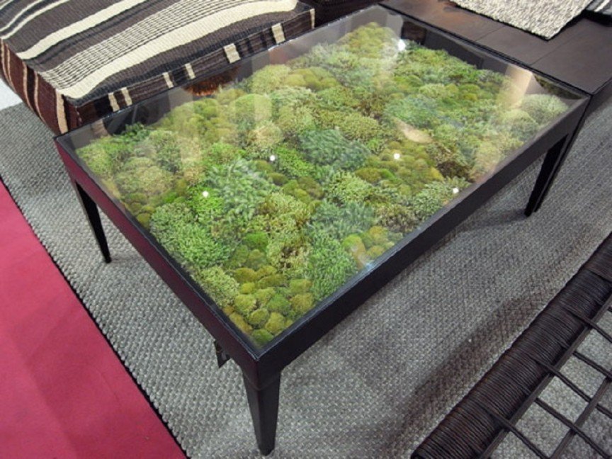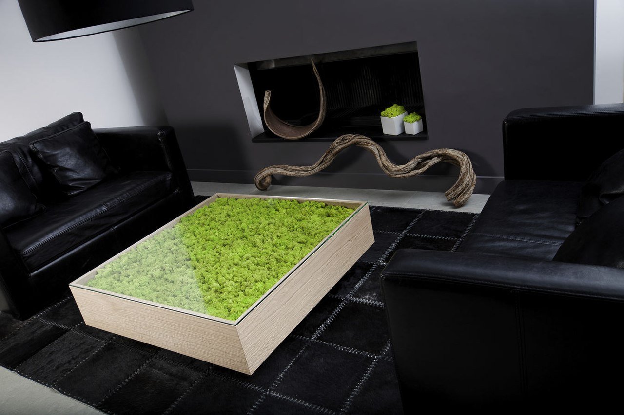 La opción más popular para diseñar plantas de esporas es el diseño de tablas.Por ejemplo, en el pasillo o dormitorio puede instalar una mesa de café, cuya mesa está decorada con vegetación. Si lo desea, puede cerrarse con vidrio, evitando que entre polvo o creando una superficie de alivio. Para escribir y mesas de comedor, se acepta una franja estrecha de vegetación en la parte de la encimera ubicada cerca de la pared. Para los modelos independientes, la opción de colocar una franja de plantas estabilizadas en el centro de la encimera es aceptable. Se puede hacer un estilo personalizado para el tablón del sofá, ubicado detrás de la parte posterior. Aplicamos esta opción para el diseño de los reposabrazos. La parte superior de la cabecera de las camas también se puede decorar con verdes estabilizados. Una solución simple sería cerrar con musgo varias celdas de un estante de madera instalado en el pasillo, dormitorio o pasillo.