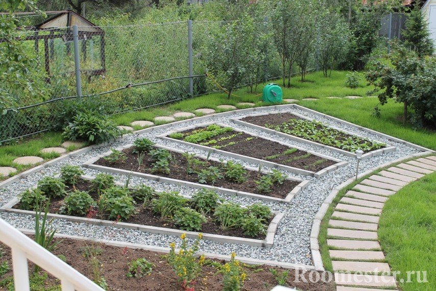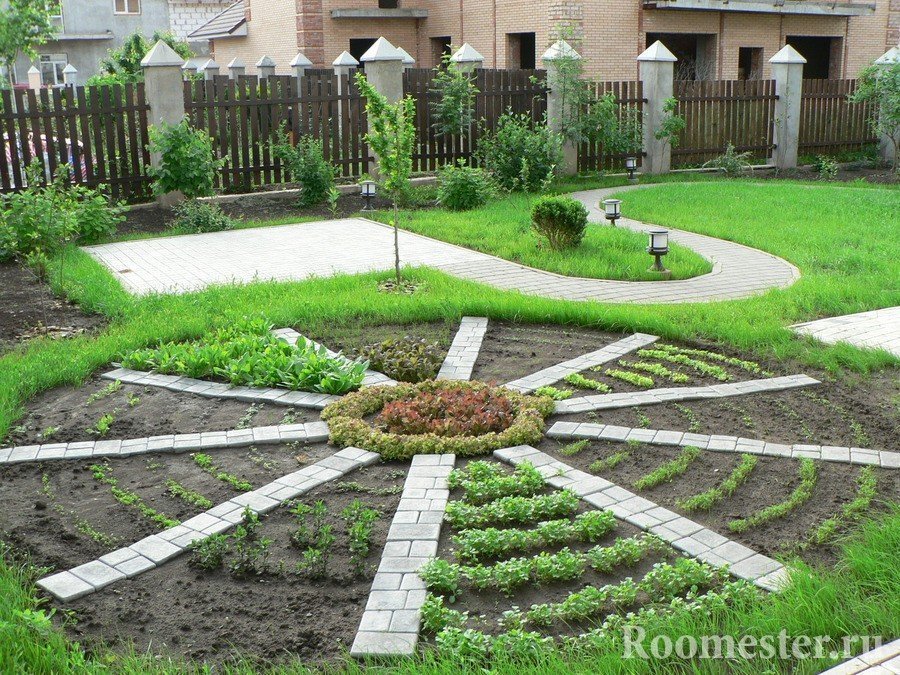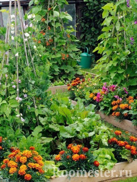 Si lo desea, puede organizar toda la parcela en forma de un gran jardín decorativo. Camas puede ser reemplazado por parterres de diferentes tamaños y formas, donde el relleno de flores será reemplazado por plantas comestibles.