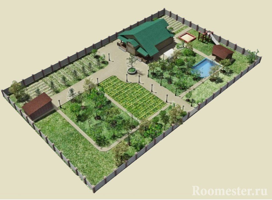 La segunda etapa del diseño es la zonificación. Aquí debe pensar cuáles serán las áreas funcionales (área de recreación, huerta, deportes, hogar, área para niños). Al evaluar las posibilidades reales de una pequeña cabaña de verano, es mejor limitarse a 3-4 zonas, determinando su tamaño aceptable.