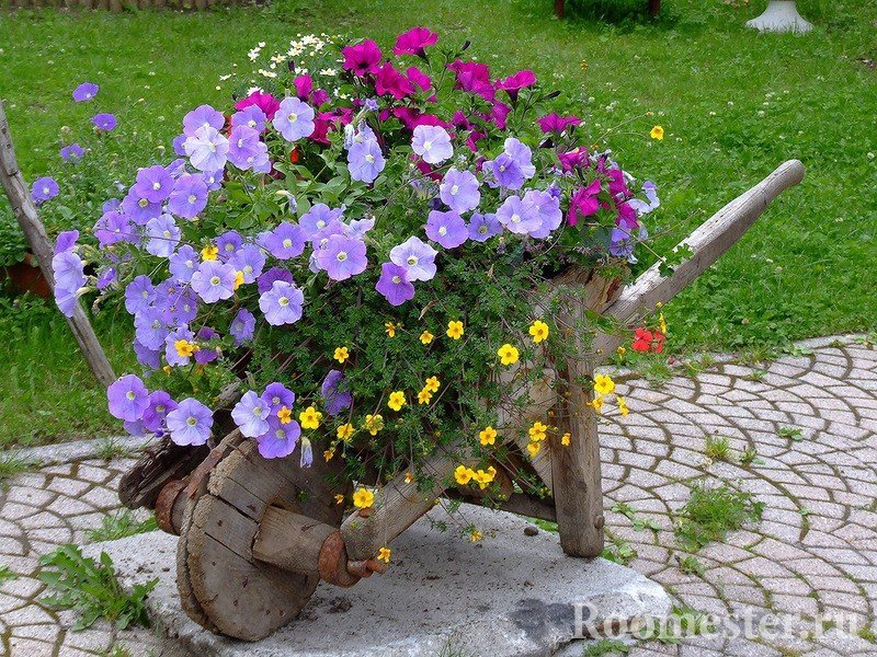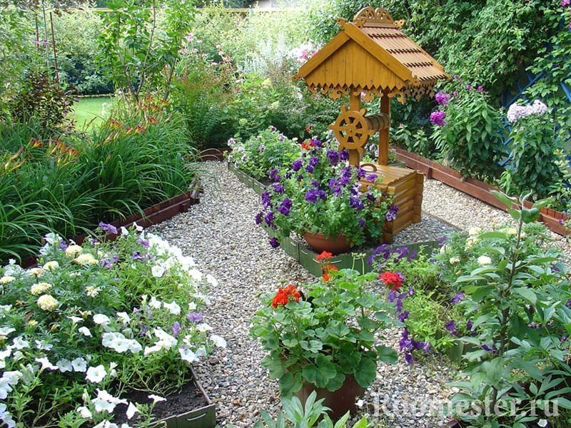 Para diversificar el diseño de la cabaña de verano, debe agregar colores en forma de flores, combinados armoniosamente con plantas fructíferas. Las flores se pueden usar tanto perennes como anuales.