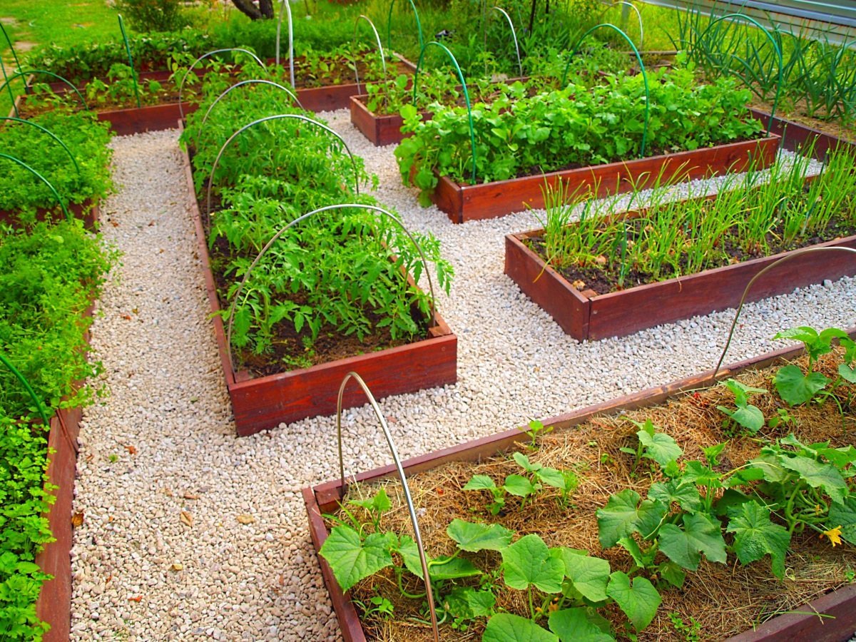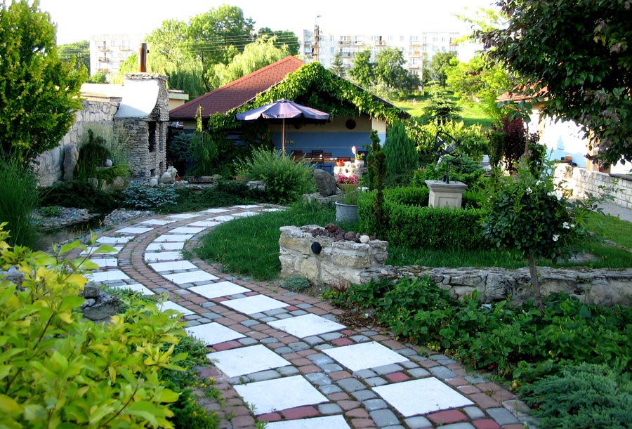 las camas de campo se ubican casi al azar, las calabazas, los pimientos crecen en las flores y las flores, siempre que sea necesario. La decoración utiliza grúas estilizadas, ruedas y carretas de madera, fragmentos de cercas tejidas de ramitas;