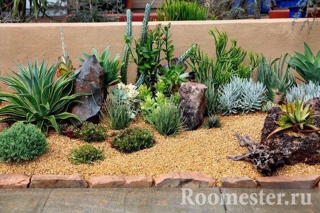 - Arenaria Una solución exótica sería un rincón del desierto en el jardín. Varios tipos de plantas suculentas y similares se plantan en la arena artificialmente arenosa.