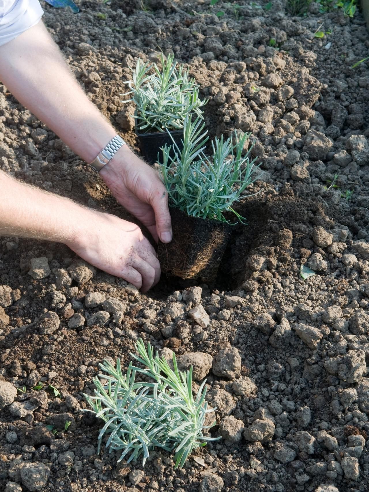 Antes de plantar, el arbusto se pone en agua durante una hora o media. Luego corte la parte superior para un mejor macollamiento. Las ramas inferiores y las raíces que se pegan fuertemente se eliminan; esto es imprescindible. Si se planifica un jardín en el jardín a partir de tablas, entonces su ancho se selecciona hasta 40 cm. En consecuencia, es igual al límite de altura. En cuanto a la profundidad del pozo para la lavanda de tamaño mediano, están orientados aproximadamente 30 cm.La distancia entre los hoyos de los arbustos vecinos se selecciona a un nivel de 30 cm (para los pequeños, 120 cm) para los altos. Los pozos están llenos de fertilizante, y una capa de corteza de pino o harina de hueso a veces se agrega encima. Todo esto se mezcla con el suelo. En caso de problemas con el drenaje, no es un problema agregar algunas piedras. Estas medidas contribuirán al inicio normal del crecimiento. La lavanda se coloca en un pozo, presionando acentuadamente contra las paredes y el fondo. Las raíces no deben estar en contacto cercano con el fertilizante. En este sentido, las capas anteriores ayudarán.