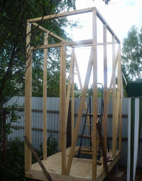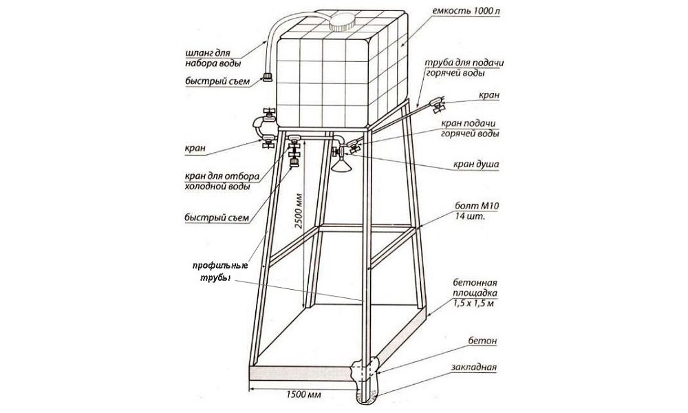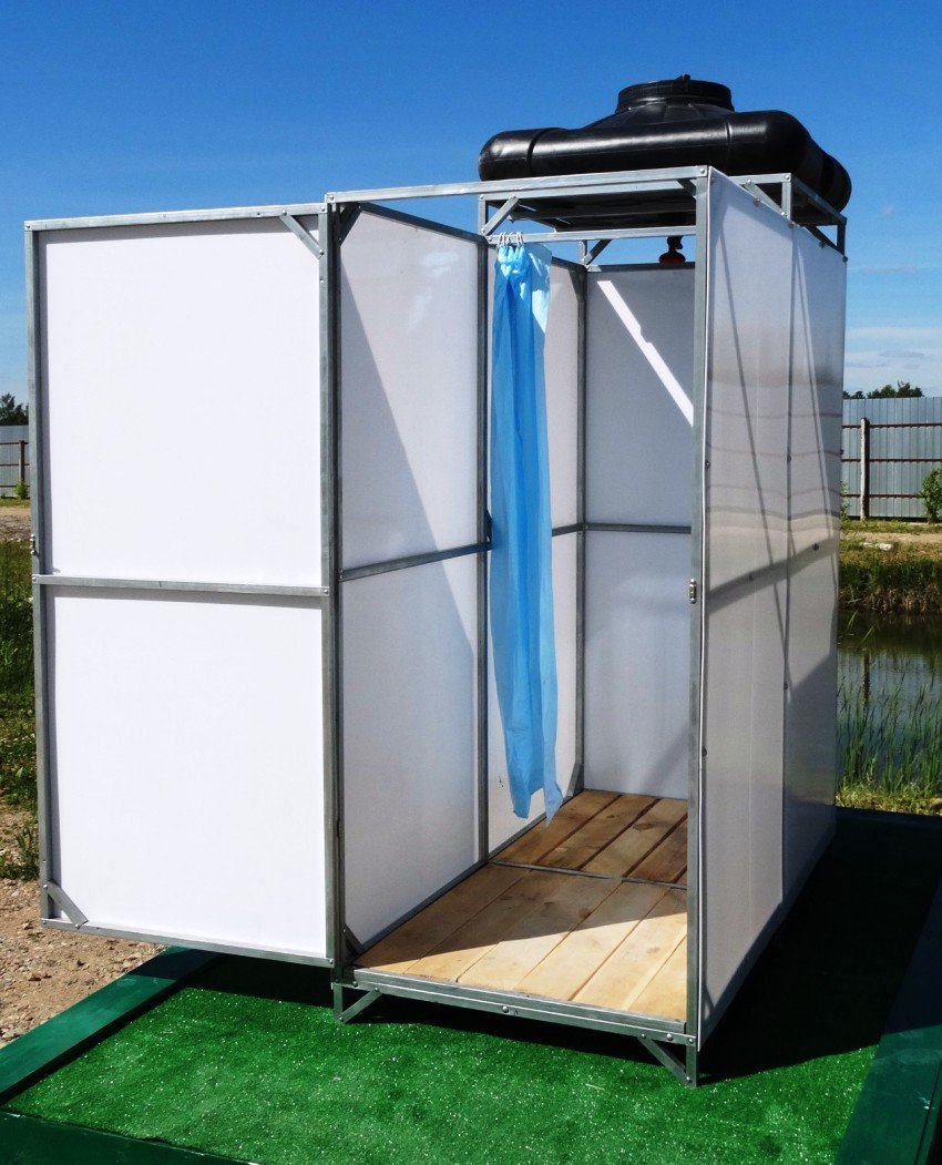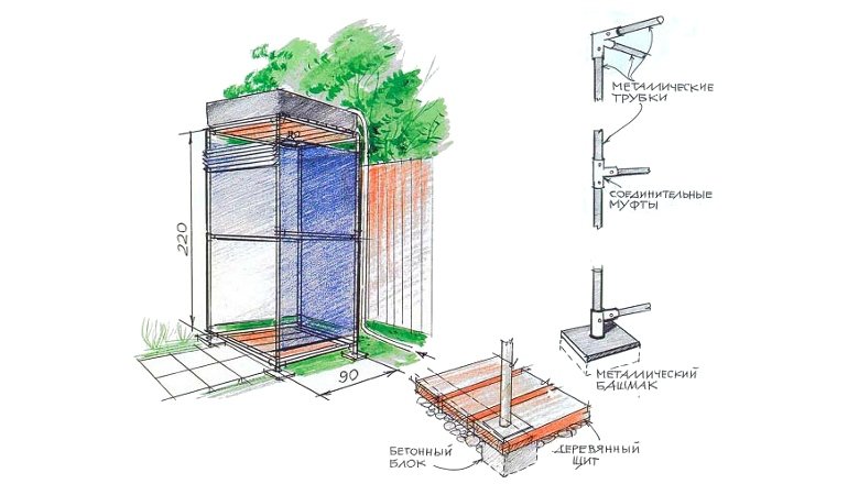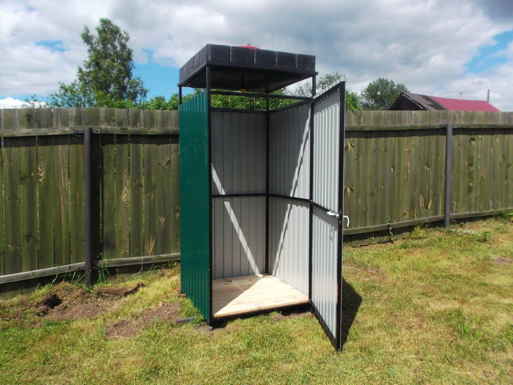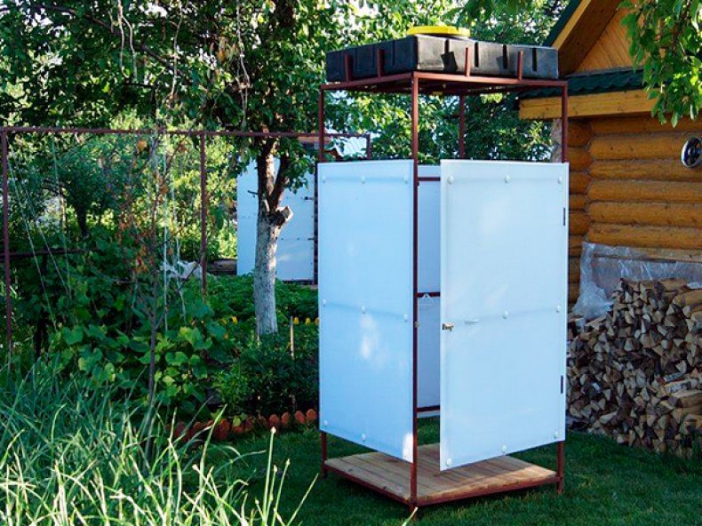 Por lo general, es un diseño conveniente y fácil de ensamblar que se puede instalar en cualquier lugar. El marco se suelda después de hormigonar la base. Para la caja del marco, necesita una tubería de perfil con parámetros de 30 × 30 mm. Una altura de aproximadamente 200-210 cm es bastante aceptable para este diseño. El ancho y el largo se pueden hacer, por ejemplo, dentro de 120-140 cm. Después de soldar el marco, sus elementos se lijan y pintan. Casi cualquier material es útil para trabajos de construcción: película, pizarra, madera. Los agujeros están mejor hormigonados. El marco debe ser lo suficientemente estable como para soportar el tanque de agua. Para crear la máscara, puede usar, en particular, una tabla de pulgadas. Debe ser cepillado, impregnado de manchas, impregnación antiséptica y decorativa. Luego, con la ayuda de tornillos autorroscantes, se une al marco de metal.