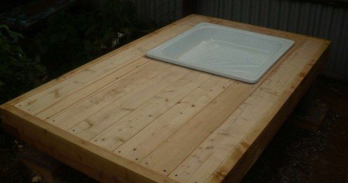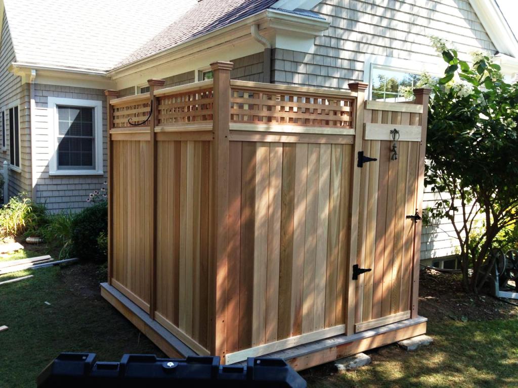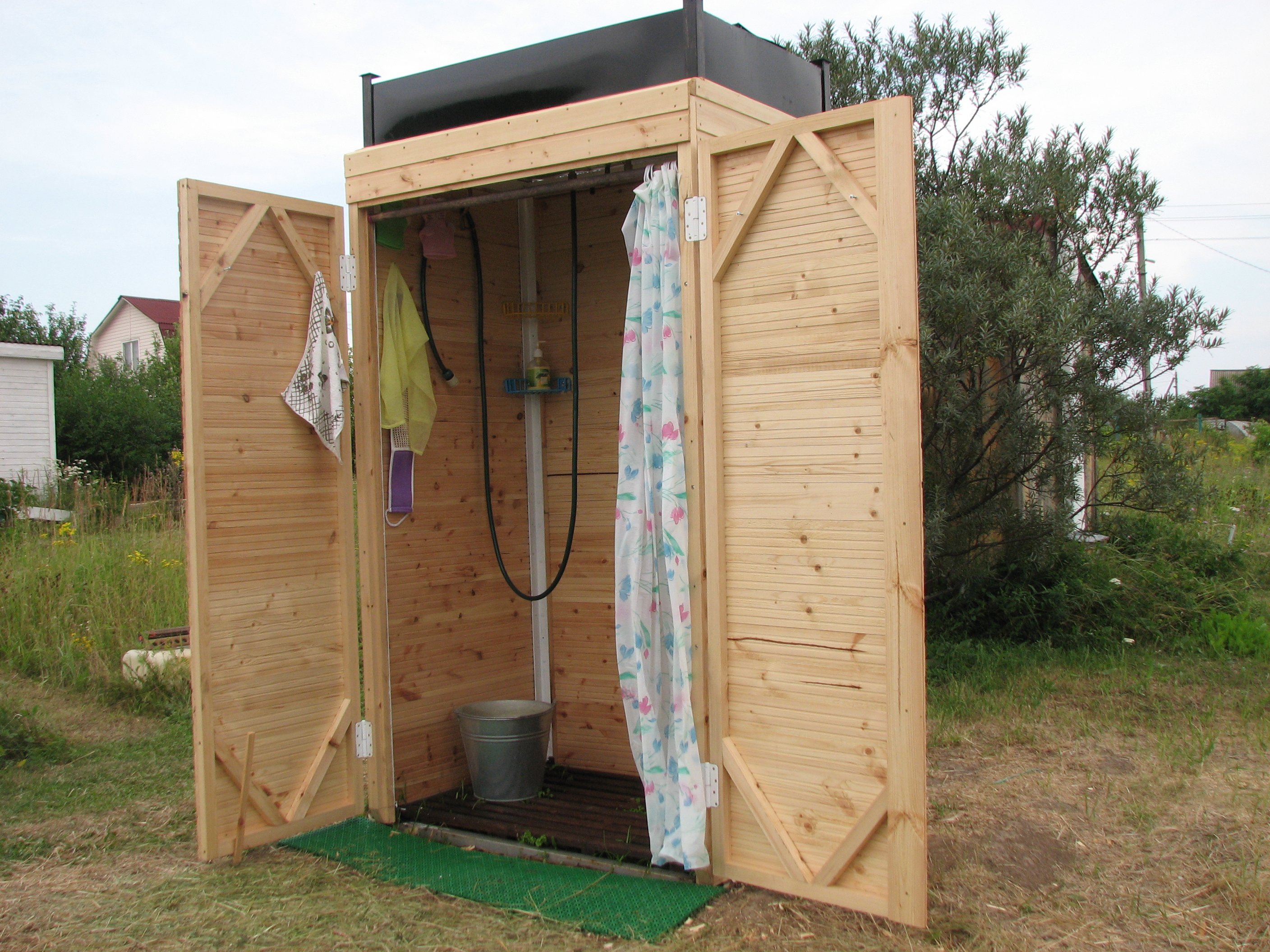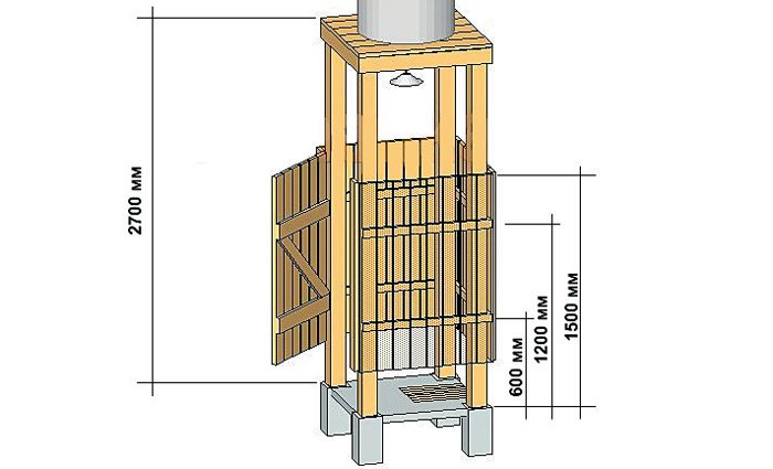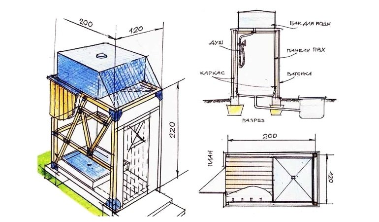 Antes de la construcción de la instalación, deberá dibujar un dibujo. Es mejor hacer la cabina espaciosa, al menos 1.5 × 1.5 m. Su tamaño mínimo permitido es 1 × 1 m. Es necesario proporcionar un vestuario, 1.5 × 0.6 m es suficiente para esto. En el área de la ducha, deberá tener en cuenta las dimensiones del futuro diseños, incluido el ancho de una barra y tablas. Las tuberías están instaladas en las esquinas. La parte superior de la estructura es más fácil de montar en el suelo y luego se fija a las rejillas laterales. Todos los ejes deben coincidir. Para el diseño final, la resistencia y la fijación confiable son importantes, debe tener en cuenta la carga de 150-200 litros de capacidad. Entre las publicaciones hacen cortes. Deben colocarse en el grosor de la pared. Para el piso, es preferible instalar un palé, cuya gran selección está disponible en tiendas de artículos para el hogar. Se coloca sobre una plataforma elevada de arena y grava.Se requieren ranuras en el piso para el drenaje. Dados estos matices, la base debe tener una altura de 20-30 cm. Si no hay tal base, el agua eventualmente se profundizará.