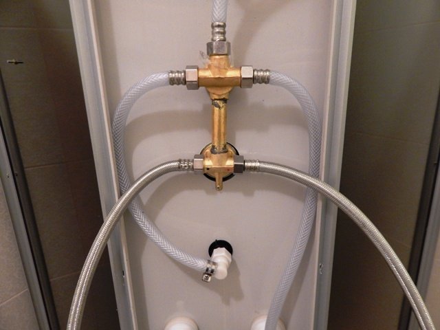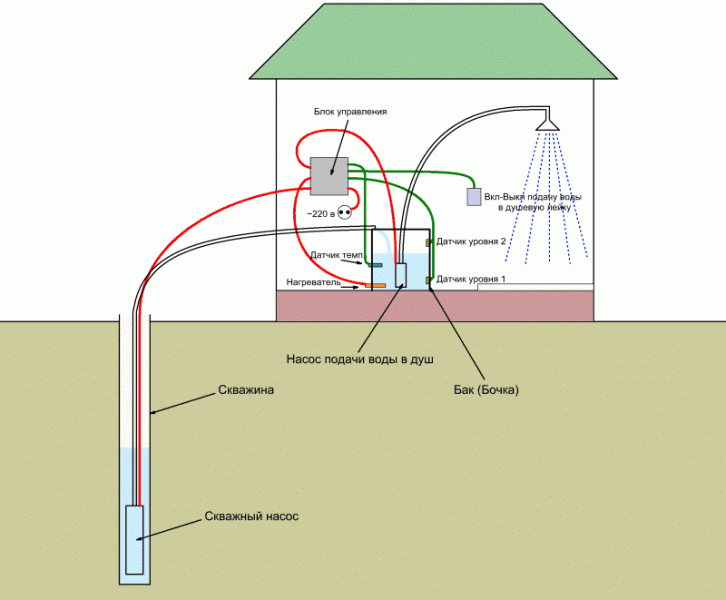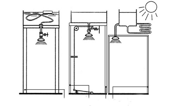 Es necesario instalar un sistema de calefacción. Esto no garantiza el flujo de agua de la temperatura deseada, por lo que existe una opción posible en la que se conectará otra al canal para mezclar agua fría y caliente y obtener una temperatura a la que sea conveniente lavar. Si se utiliza calefacción eléctrica, la conexión a tierra se realiza en ambos lados o cerca de todas las esquinas. Dentro de la cabina, vale la pena sostener un adaptador para la ducha, de modo que sea más conveniente que la gente baja se lave. Todavía necesita un cabezal de ducha extraíble. No muy lejos de la cabina de ducha, pero por separado, se coloca un motor de arranque que enciende un calentador eléctrico tubular (TEN).Se requiere una bombilla en la fuente de alimentación para mostrar el estado encendido. Cerca debe haber un dispositivo de apagado de protección en caso de un mal funcionamiento en el calentador. Los terminales del calentador eléctrico deben protegerse de manera confiable del agua o la lluvia.