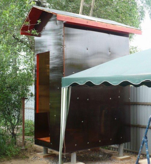 Además del hule, también se pueden usar otros materiales de revestimiento como revestimiento. Un edificio de plexiglás y pizarra se verá bien. Estos son materiales duraderos e impermeables, pero no retienen bien el calor, no son adecuados para la primavera y el otoño. El acero galvanizado es duradero, pero apropiado para los días más cálidos de la temporada de verano o para regiones subtropicales.