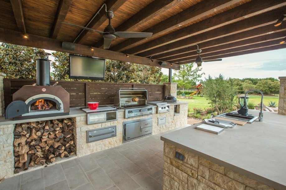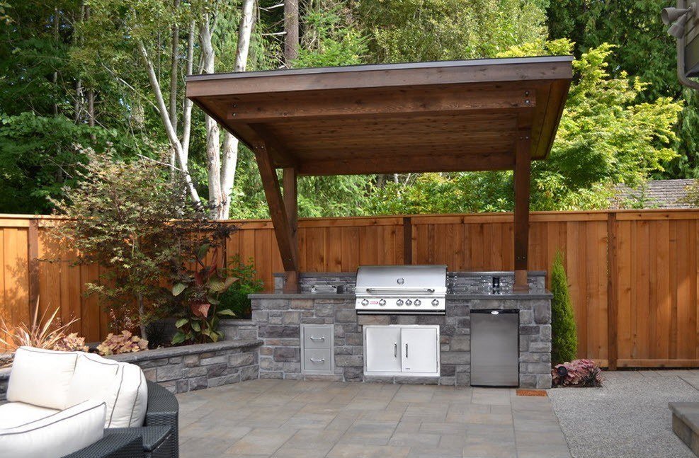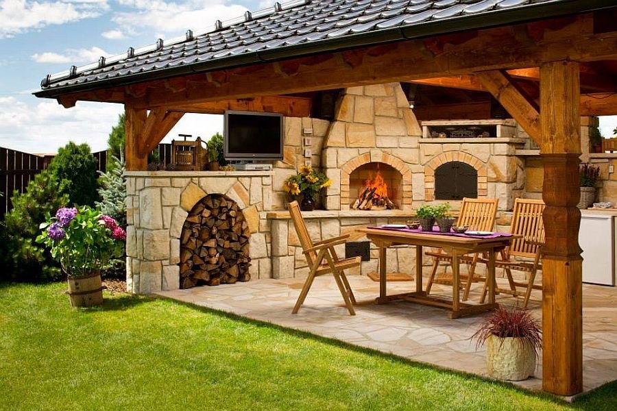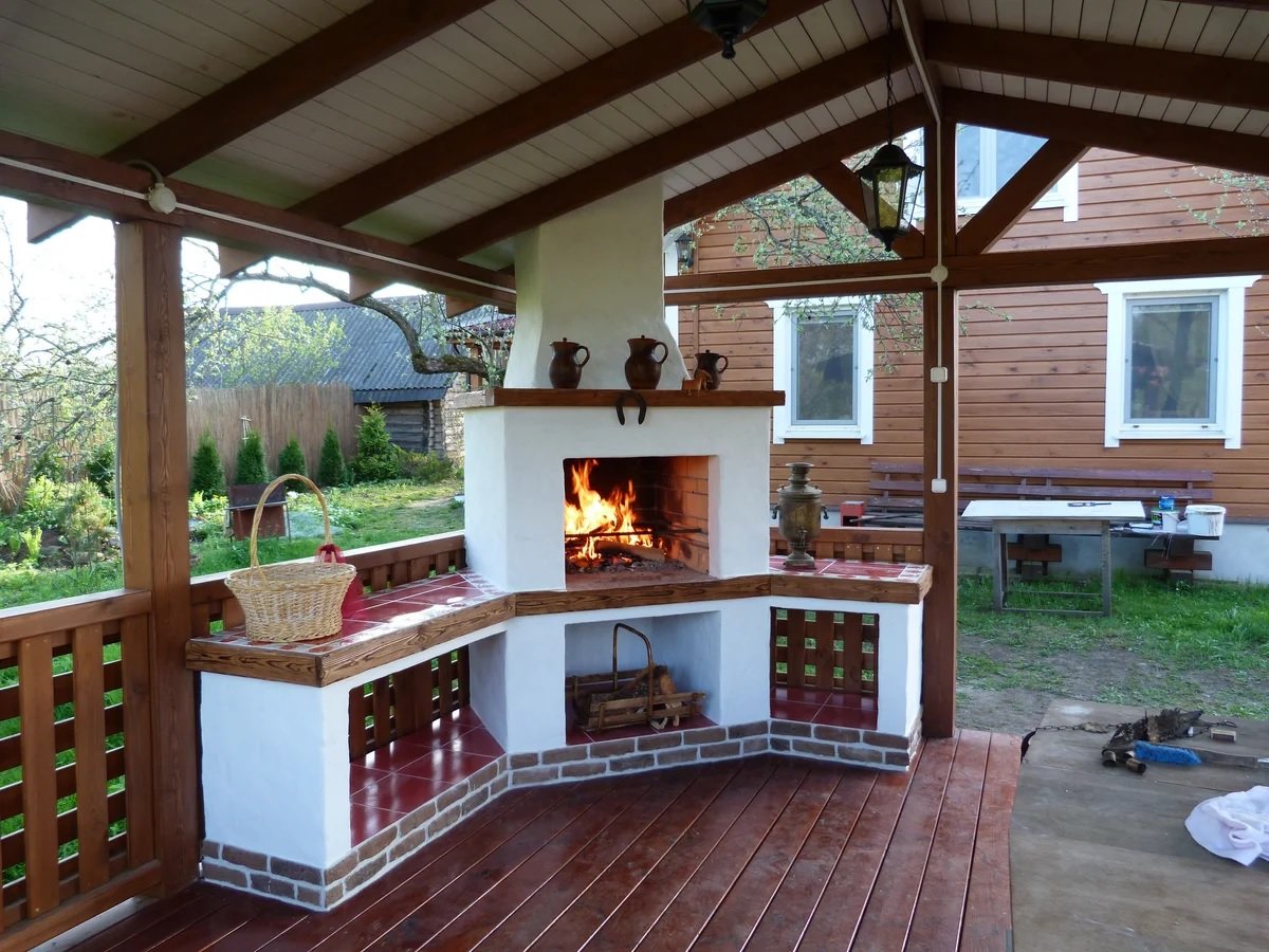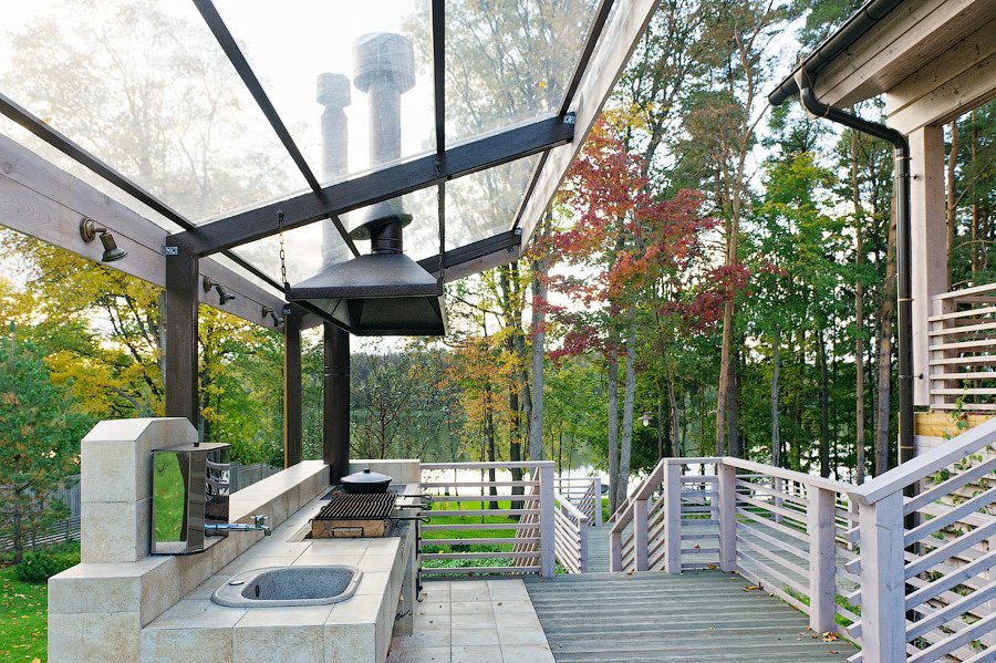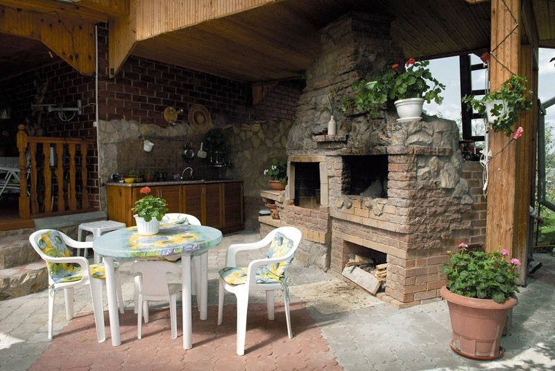 Abierto. La mayoría de las veces se combina con un área de recreación. La barbacoa no encierra. Esta opción es adecuada para aquellos que tienen un presupuesto muy limitado.