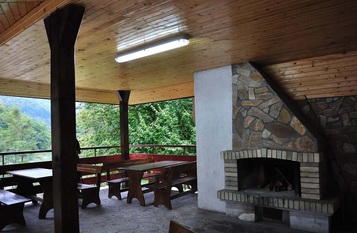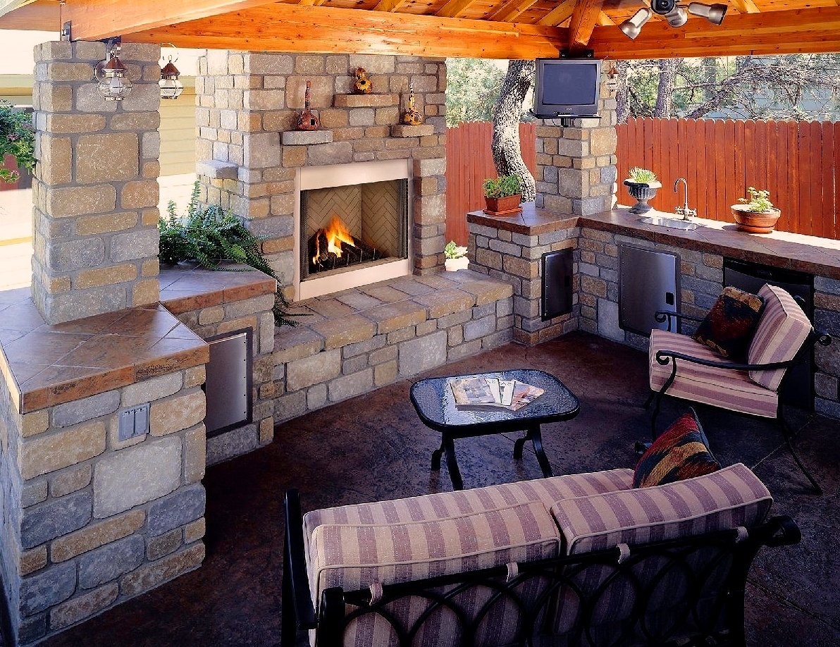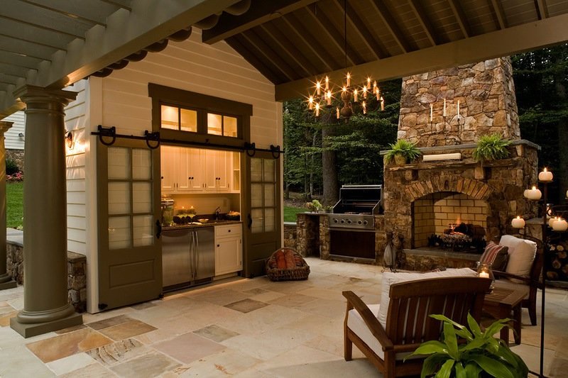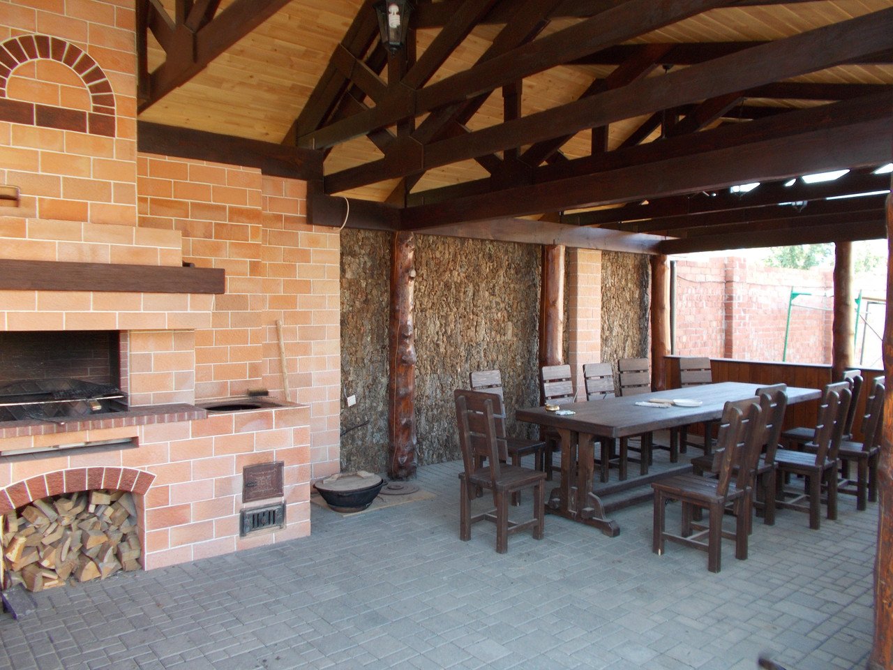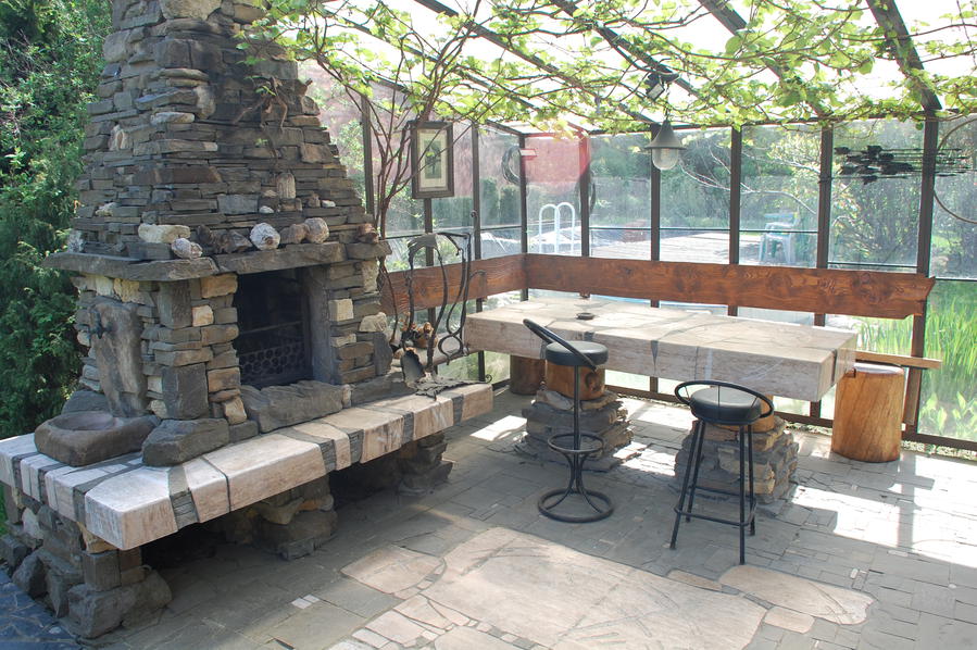 Veranda En ella, la zona de brasero está protegida por todos los lados.Un hogar monumental con chimenea, más parecido a una estufa, se erige en dicho anexo, se instalan muebles masivos. La terraza todavía se considera parte de la casa, por lo tanto, su interior es en muchos aspectos ecos de la parte residencial del edificio. La zona de Mangal se puede combinar. Por ejemplo, a menudo se combina con un baño. El hogar se encuentra cerca, y el comedor está equipado en el amplio porche del edificio.