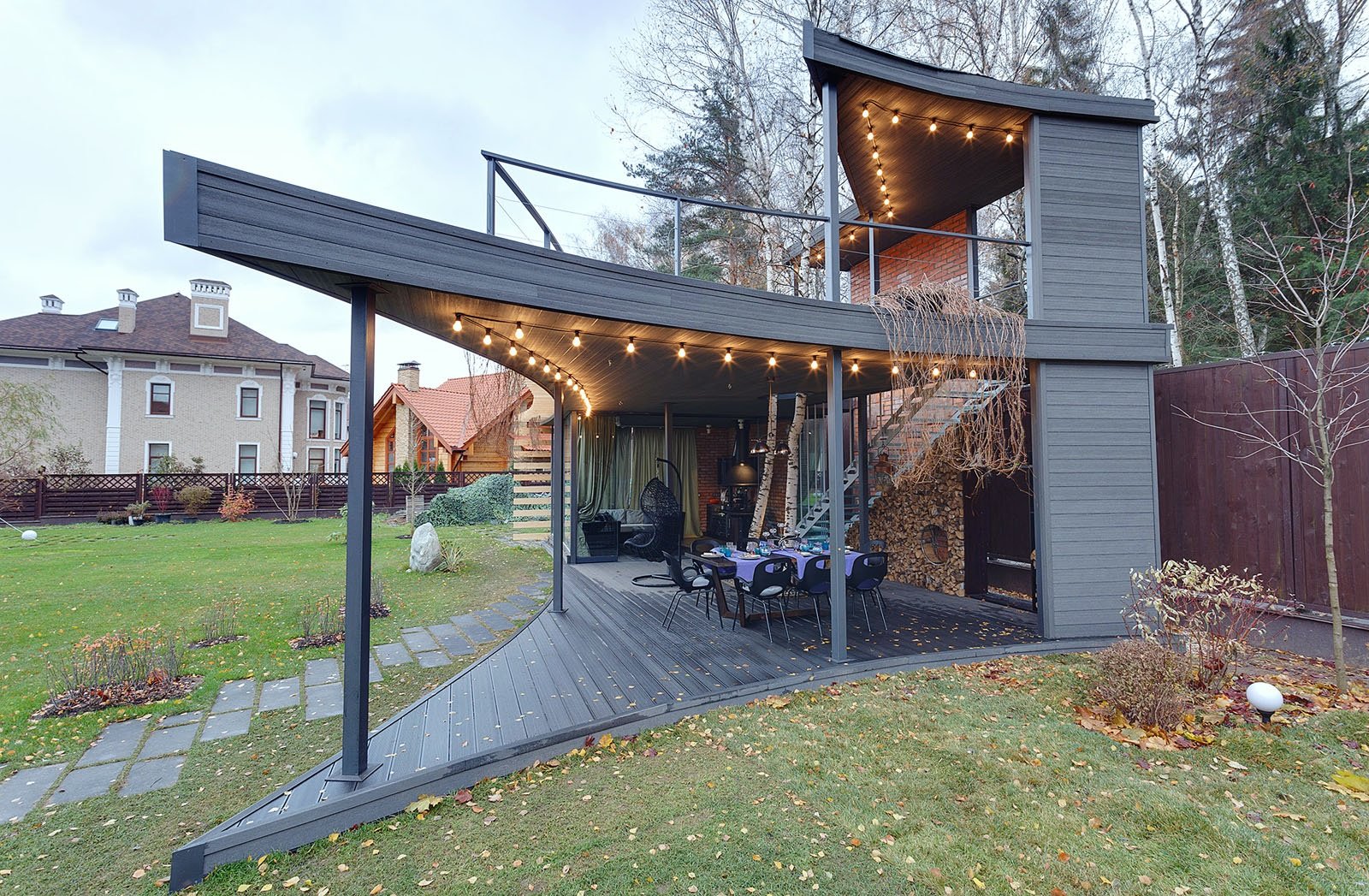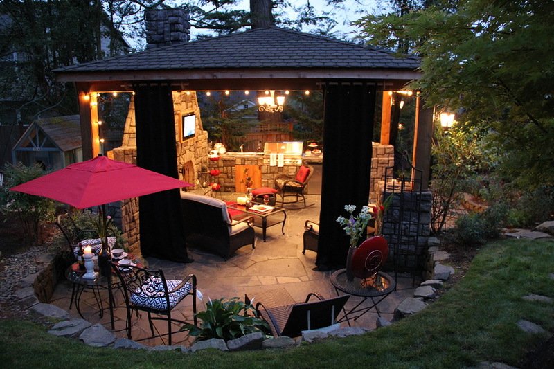 Medio abierto La zona está equipada con una cubierta sobre soportes o, por el contrario, no tiene techo, pero está cerrada por todos lados. En lugar de paredes de alto grado, se cuelgan cortinas que protegen contra el viento y el clima. Al mismo tiempo, actúan como una decoración elegante.