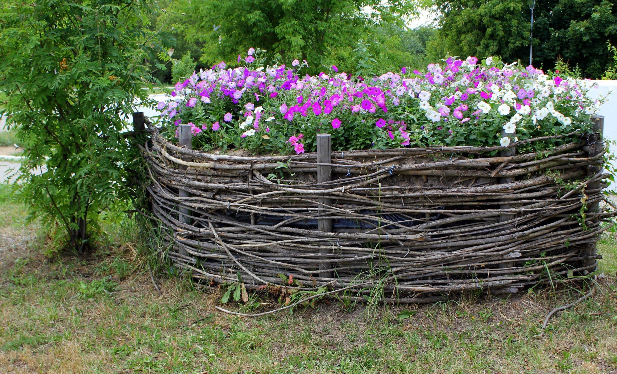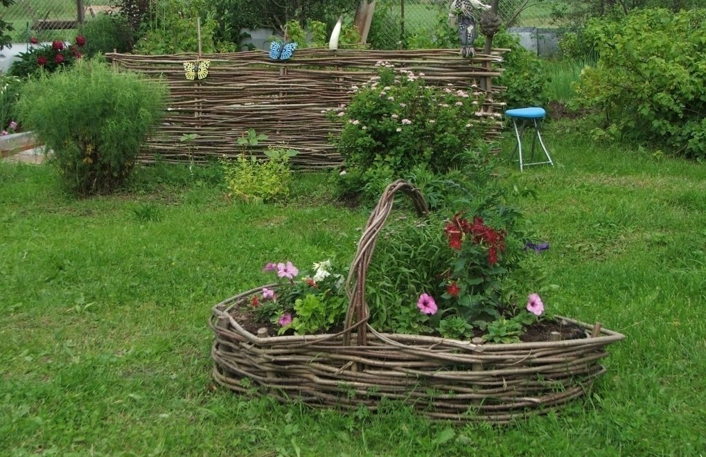 Anteriormente, las cercas de mimbre se plantaban con girasoles y campos de maíz. Tal decoración se considera clásica. Las opciones modernas implican plantar flores frescas, así como el uso de flores artificiales. Se puede crear un arreglo floral a partir de capuchinas, crisantemos, asteres, margaritas. Lona de valla de mimbre: un lugar adecuado para trepar plantas. La monótona fila de una tienda de tablas, cortes y tocones se diversifica. Se acostumbra colgar macetas en la parte superior de los postes de soporte. Del mismo modo, puede usar pequeños animales de peluche, botas, etc. Puede acercarse a la decoración más a fondo. Por ejemplo, levante y coloque varias docenas de piedras decorativas grandes de diferentes colores cerca de la cerca de acacia, instale 1-2 macetas con vegetación verde saturada y una rueda de un carro viejo sobre ellas. Obtenga una composición espectacular y económica. Se puede erigir un arco de mimbre al lado de la puerta.