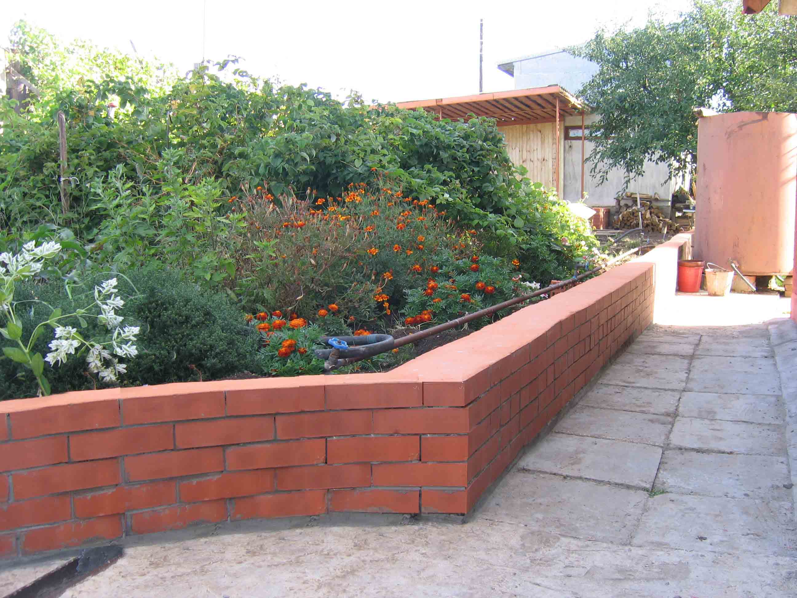 Este es uno de los materiales más económicos. Además, los ladrillos permanecen después de la construcción de otras instalaciones. Para el revestimiento decorativo, se utilizan fragmentos de residuos, así como elementos viejos y rotos. El ladrillo es el mejor material para retener estructuras con geometría compleja, por ejemplo, con protuberancias, huecos, esquinas, redondeos. La tecnología de mampostería no es diferente de la construcción convencional. Al mismo tiempo, para barreras bajas, eligen colocar en medio ladrillo. Las fortificaciones por encima de 1 metro se erigen con electrodomésticos en ladrillo completo, además con refuerzo de refuerzo. La base está equipada con vendaje y drenaje de grava. Se realiza un sistema de drenaje reforzado detrás de la pared, ya que el ladrillo no tolera bien la humedad. La construcción generalmente se termina con azulejos decorativos. Los diseñadores usan texturas y colores.