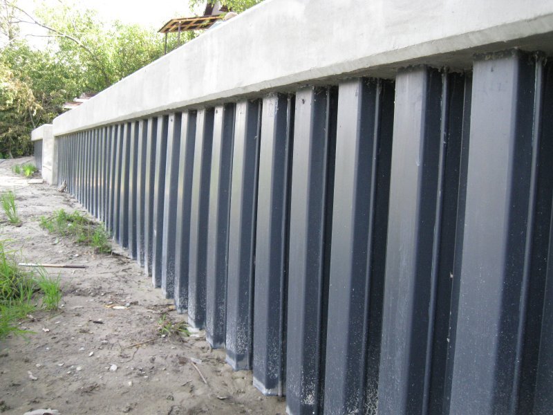 El diseño consistirá en una fila continua. Todo se elige como material: hormigón armado, madera, metal e incluso plástico. Las superficies laterales de las pilas están equipadas con cerraduras de conexión delanteras y traseras. Primero, una pila con una conexión frontal se introduce en el suelo. Después de eso, se monta un elemento con un bloqueo trasero, en la dirección de este soporte.Ambas partes se unen y se agregan densidades usando un aglutinante. También evita el desplazamiento longitudinal de los pilares entre sí. A lo largo de la zona peatonal, la altura de la barrera debe ser de al menos 1 m. Para las cercas, se forman sistemas de drenaje para la salida de aguas subterráneas y atmosféricas. Hacen canales y surcos con grava y piedra triturada. La impermeabilización se organiza con dos capas de betún caliente, un segundo adicional, en caso de que haya compuestos en el suelo con una reacción agresiva a las composiciones de betún.