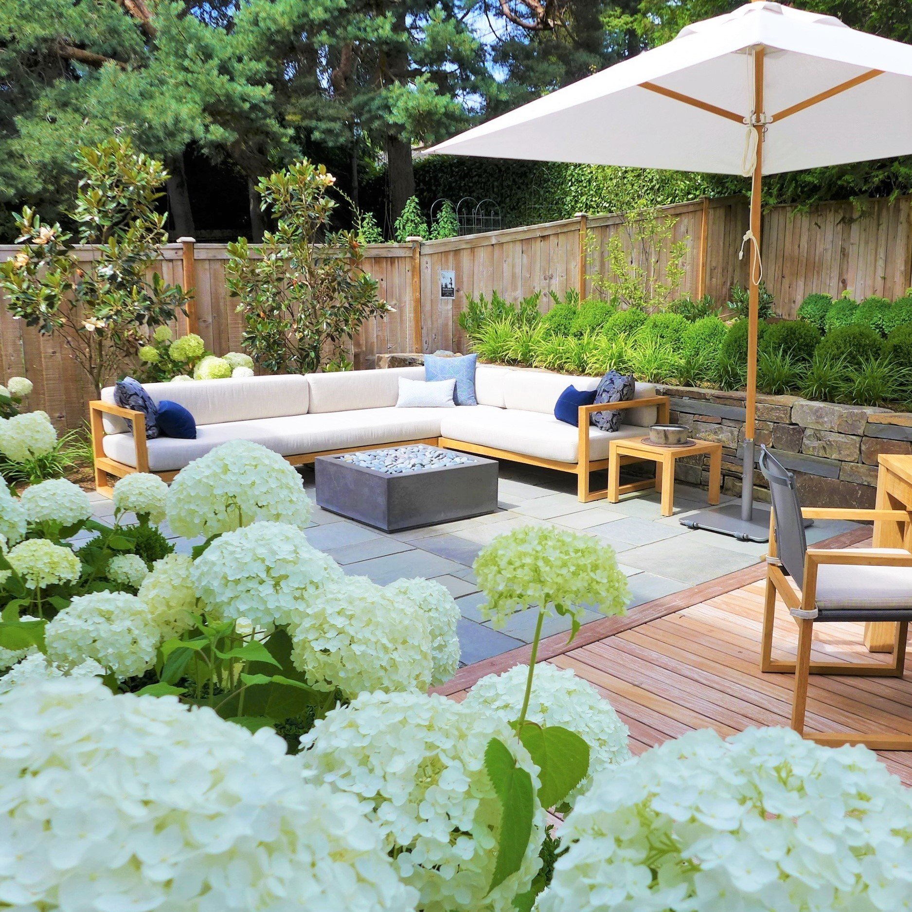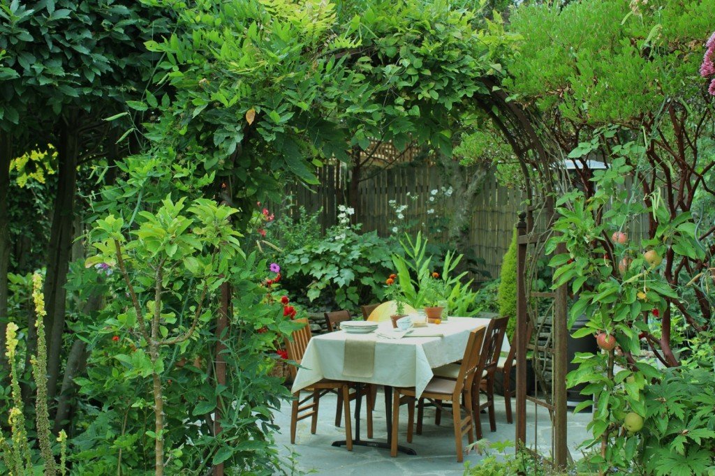 Patio trasero equipado con muebles tapizados, mesa de comedor, tumbona y pufs. Este sitio está decorado al aire libre o decorado con una pérgola entrelazada con hiedra, uvas, clemátides.