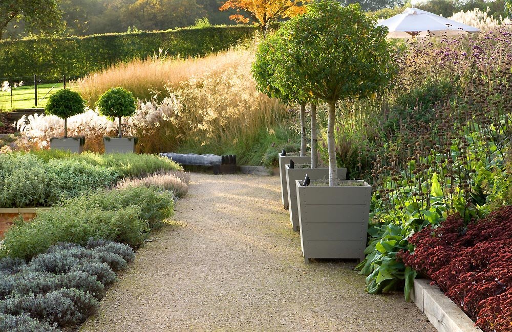 Todas las áreas están aisladas entre sí mediante senderos de jardín, cercas, parterres o elementos decorativos.