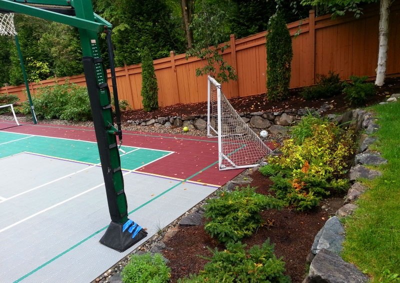 Un área de juegos y deportes puede incluir una cancha de tenis, toboganes y columpios para niños, un sistema de barras horizontales e incluso algunos tipos de máquinas de ejercicios, si el hogar es aficionado al ejercicio en la mañana. Su colocación no es práctica en áreas con un área pequeña. En estos casos, es mejor limitarse a columpios compactos y un tobogán. Las instalaciones deportivas y de entretenimiento se encuentran tradicionalmente en el patio trasero. Generalmente limita con un área de relajación y un jardín.