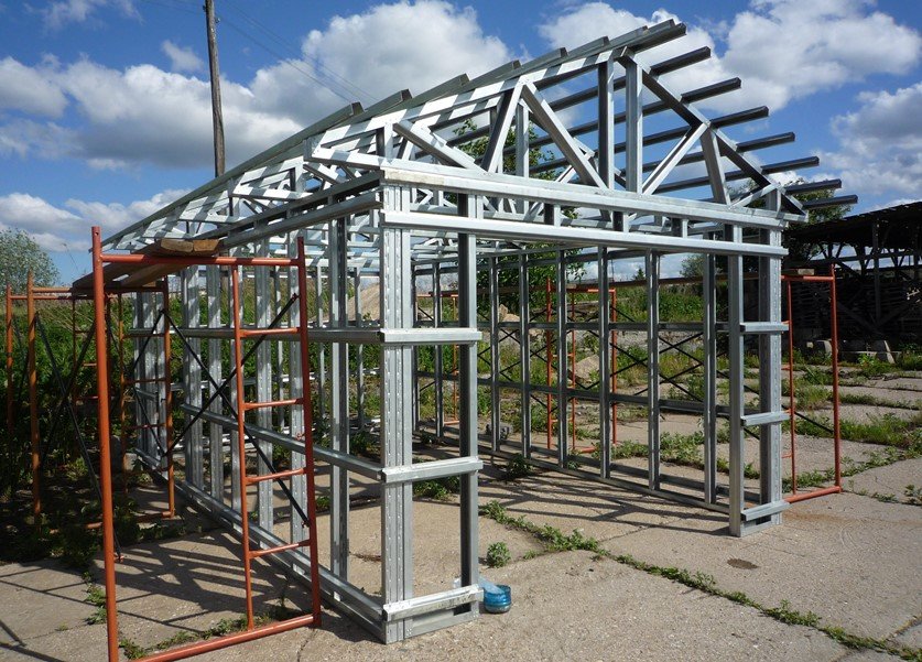 Incluyen un marco de canal y revestimiento de cartón corrugado. Además, pueden aislarse con espuma. La ventaja de tales cobertizos es la fiabilidad y durabilidad. A pedido de tales objetos, puede construir un hozblok de dos pisos. Las desventajas de tales cobertizos son el alto costo y la complejidad del transporte.