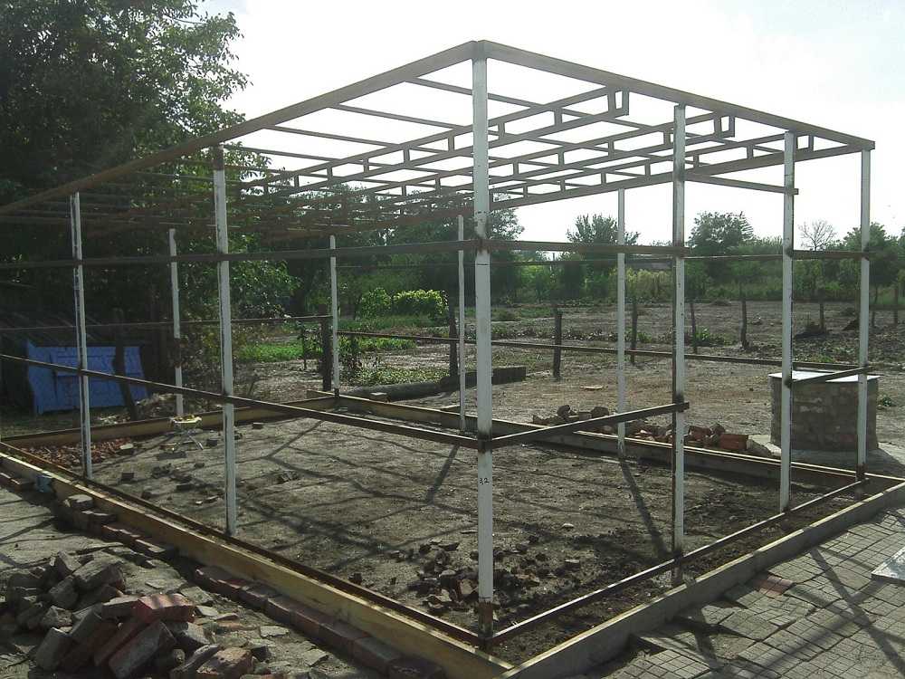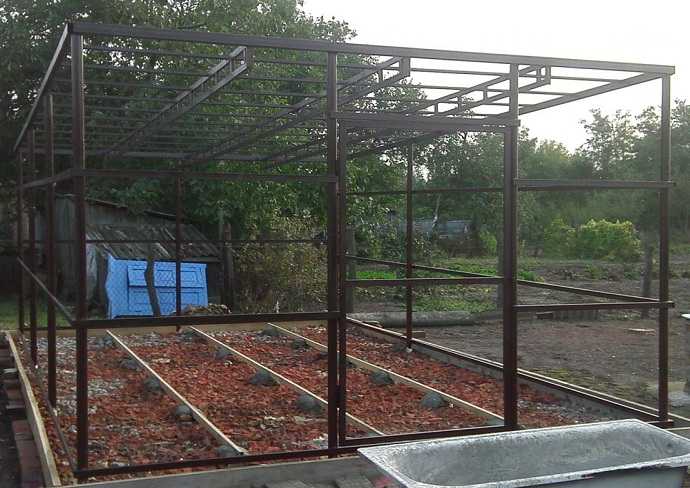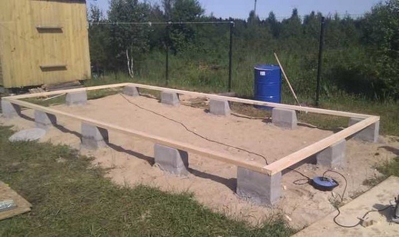 Excavar agujeros en las esquinas del pozo con una profundidad de 70 cm. Llenado de arena, grava, instalación de bastidores metálicos o tuberías cuadradas.