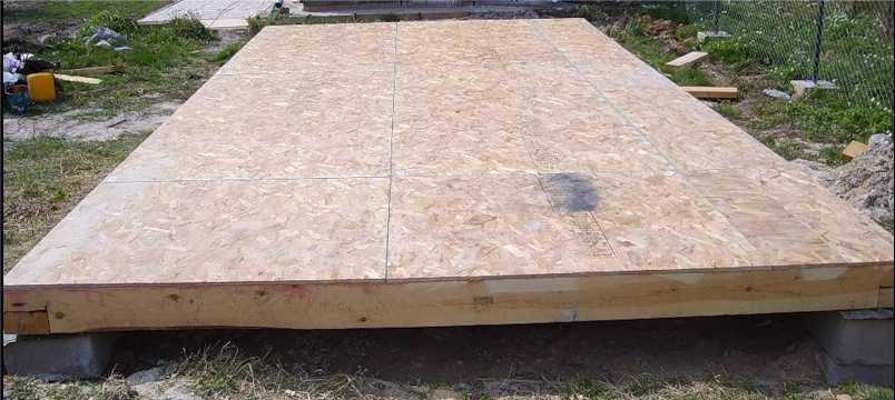 Una tabla de piso de aproximadamente 2 cm de espesor está clavada en la parte superior del piso "rugoso".
