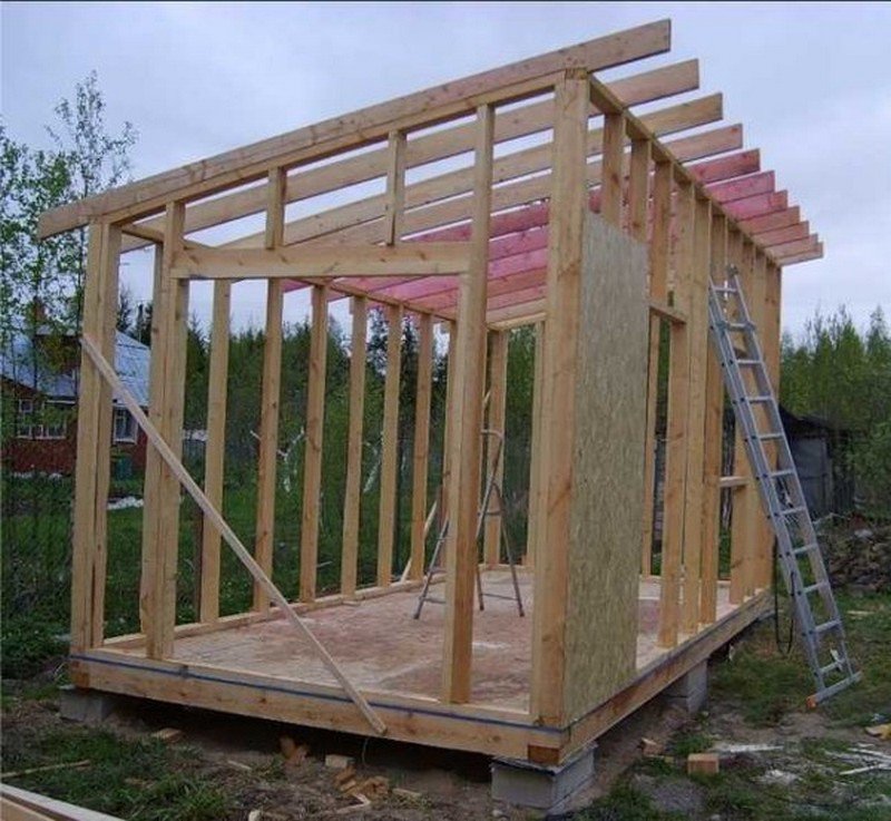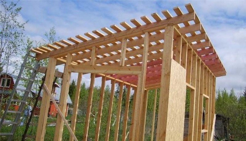 Debido a la preparación de la moldura superior en el proceso de ensamblaje de las paredes, la instalación de un techo de cobertizo será simple y rápida. Los materiales de construcción preparados deben tratarse con un antiséptico y solo luego usarse. Se está instalando un sistema de viga para un techo inclinado de acuerdo con el siguiente esquema: