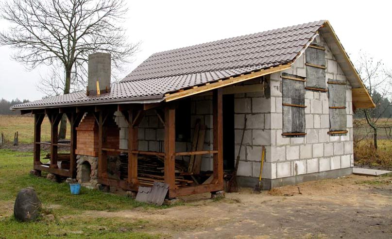 Después de construir las paredes y endurecer el mortero, puede comenzar a levantar el techo. Se coloca una capa de material para techos sobre las paredes para crear una impermeabilización competente.A continuación, se realiza el cálculo del Mauerlat: la viga, que es la base del techo futuro. Para un Mauerlat, generalmente se usa una viga con una sección transversal de 15x15 cm. El paso entre elementos adyacentes es de aproximadamente 30 cm. El Mauerlat se fija con pernos. A continuación, se ensamblan las vigas. Cada par de patas de viga representa un ángulo, cada esquina ensamblada se fija en la barra transversal. El paso entre las vigas debe ser de 30 cm. La estructura terminada se instala en el Mauerlat. En la parte superior, una tabla de cresta se une adicionalmente a las patas de la viga para crear una estructura fuerte y confiable. A continuación, se realiza el torneado de las patas de la viga y la instalación de madera contrachapada (como base niveladora debajo del techo) o el material de techo seleccionado.