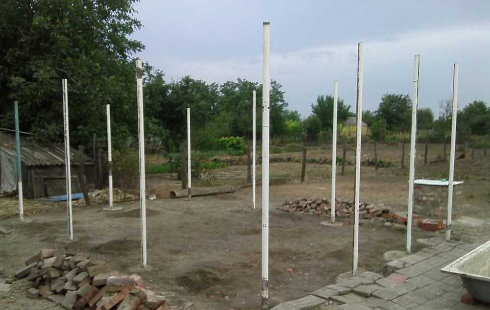 Los hoyos se cavan hasta una profundidad de aproximadamente 90 cm. En el fondo se coloca una almohada de piedra triturada y arena. Sobre los ladrillos con mortero de hormigón, se construyen columnas. Si la parte central de los pilares permanece hueca (con colocación especial de ladrillos), se vierte con hormigón.