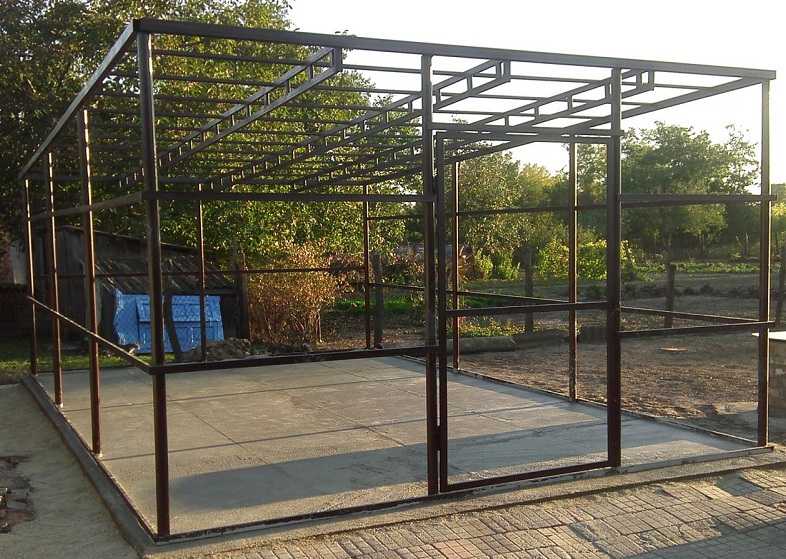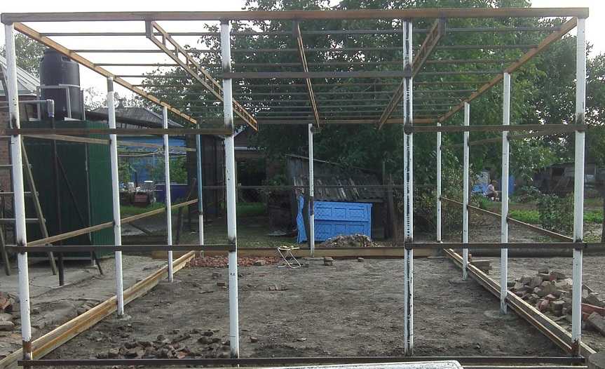 Montaje del marco bajo un techo de cobertizo: recorte apropiado en un ángulo de un par de bastidores, soldando con perfiles auxiliares.