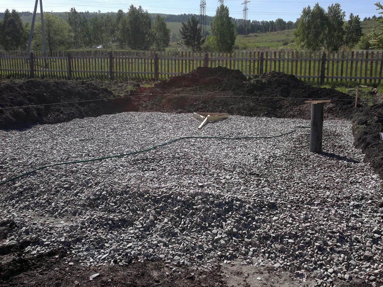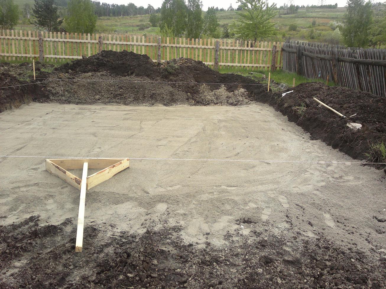 Se apisona el suelo, se vierte una almohada (una capa de arena de 15 cm) en el fondo y también se apisona.