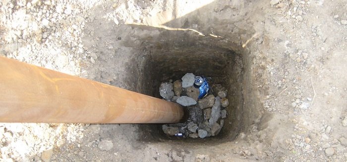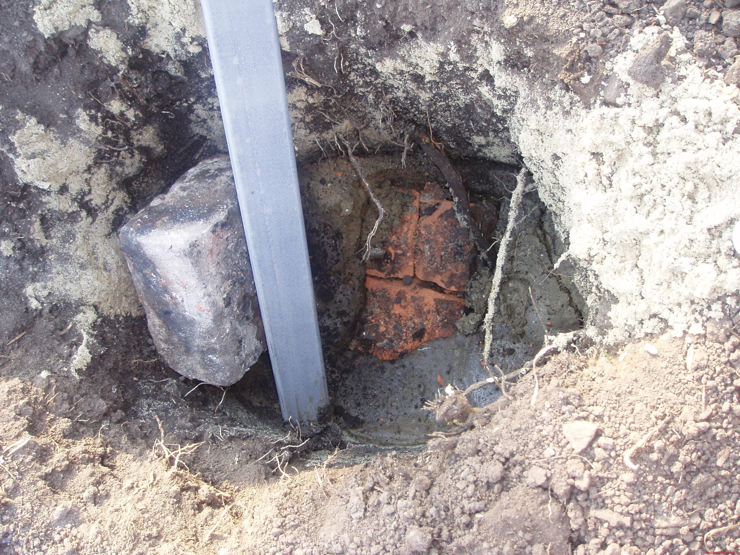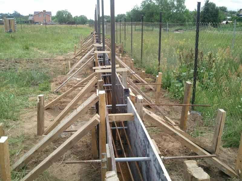 Primero, el suelo se libera de todo lo que impediría la fijación de los montantes u hojas.Si la hoja perfilada comienza a colapsar, lo más probable es que, a partir de las piedras debajo, el defecto a partir del cual aumentará gradualmente. Es necesario formar la base con esto en mente, así como la curvatura del relieve. No será necesario un estudio del suelo, porque para construcciones relativamente livianas a partir de una lámina perfilada, se proporciona el uso de una base de banda poco profunda. Suficientes 30-40 cm, si no hay vientos fuertes en la región, y de lo contrario, ya será necesario de 50 a 150 cm. La profundidad de la base también está coordinada con la altura de los pilares de la base: 1/3 de su altura y 10-15 cm de reserva para el fondo del pilar. En el caso de bastidores intermedios, 1/4 de la altura es suficiente. El ancho mínimo permitido del pozo coincide con el grosor de la columna de soporte más ancha.