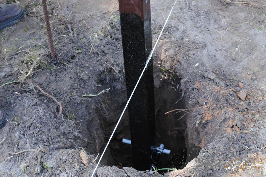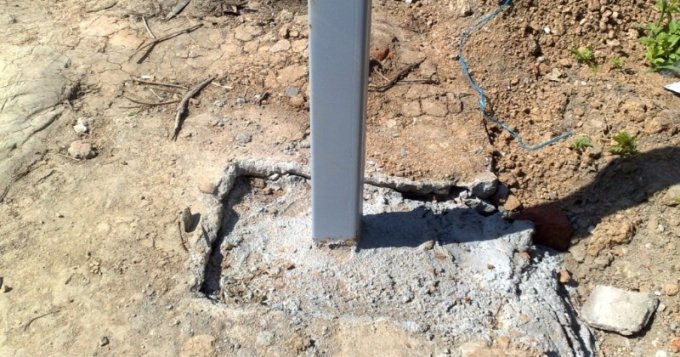 En primer lugar, se instalan los soportes básicos. Si la cerca consta de secciones, las rejillas se ubican en los bordes. Las cuerdas se estiran entre los soportes principales para tener una guía al instalar los intermedios. En los puntos de inserción de los montantes en el suelo, el suelo se elimina con marrón, después de lo cual se forma un cojín de arena y grava. Es en esos lugares donde se colocan los postes tratados con compuestos anticorrosivos. Algunos maestros prefieren el hormigonado a una profundidad de 10-15 cm, lo que aumentará la resistencia al reforzar el encofrado y su posterior relleno con hormigón. Para introducir los bastidores en el suelo, se debe proporcionar una almohada de unos 20-25 cm de altura. La ventaja de esta opción se expresa en una mayor fiabilidad y economía, sin embargo, se asocia con grandes esfuerzos. La instalación de los soportes se lleva a cabo sin formar una base, sujeta al nivel, así como a la relación entre la profundidad de instalación y la longitud del soporte.