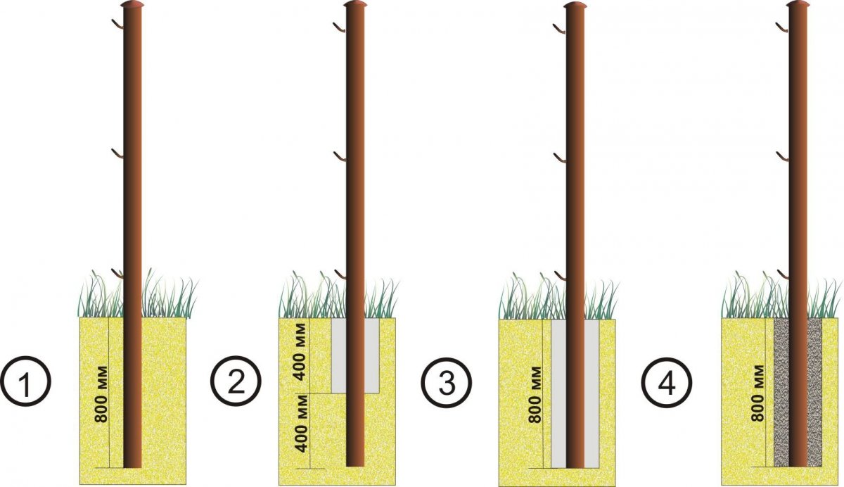 Use pilares no solo de metal, sino también de madera, piedra, ladrillo u hormigón. La primera opción es simple, confiable y asequible, además, se combina mejor con el perfil. Las tuberías metálicas de forma cuadrada tienen paredes de 2 mm y parámetros de 60 × 40 o 40 × 40 mm, dependiendo de la carga. Los tubos redondos varían en diámetro: 60-100 mm. En tiendas especiales venden tubos terminados para cercas, para usar en suelos de cualquier tipo, y no menos pilas universales, que se instalan, incluso en margas y suelos normales. Las columnas terminadas son mejores que otros materiales. Ya tienen tapones para evitar que entre agua. Las tuberías para cartón corrugado están equipadas con un talón especial, que facilita la instalación en la almohada. Típicamente, el diseño de los bastidores incluye orificios para el montaje de cartón corrugado.